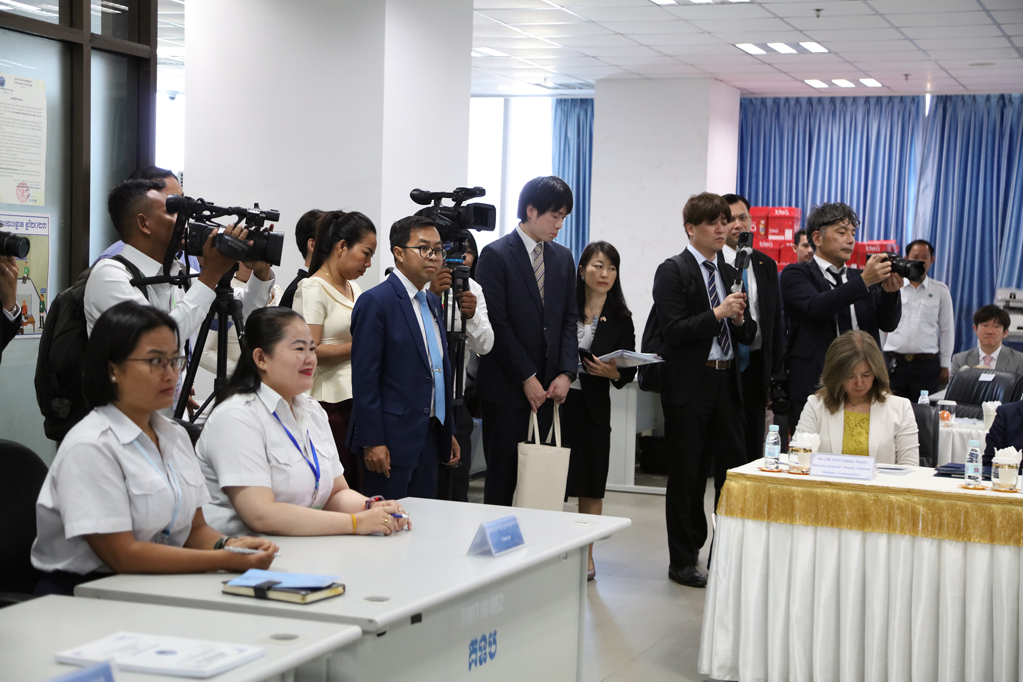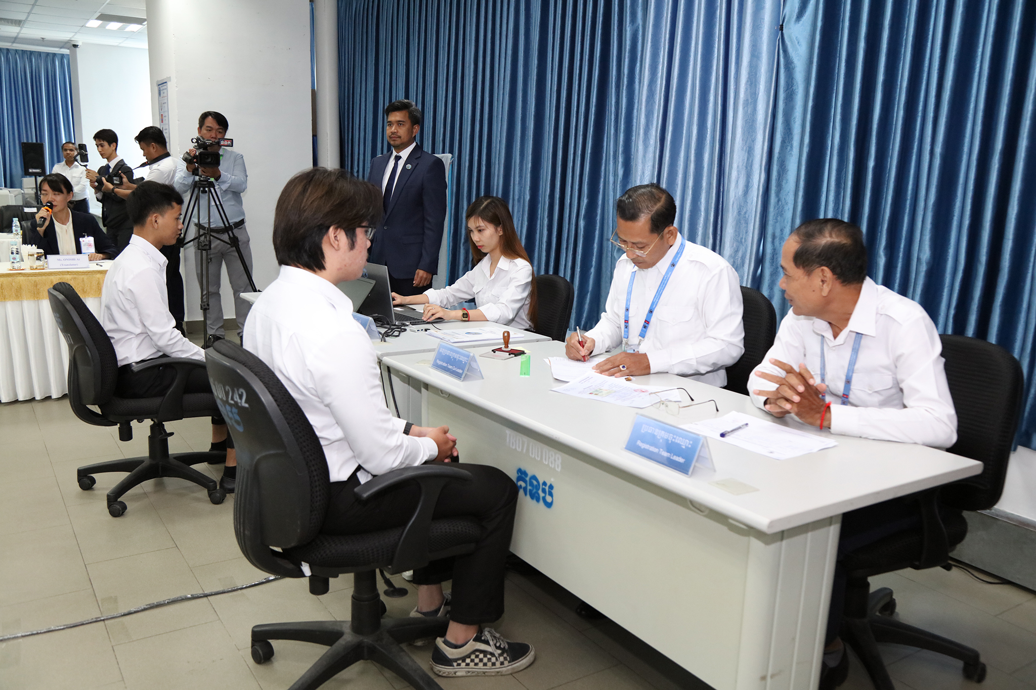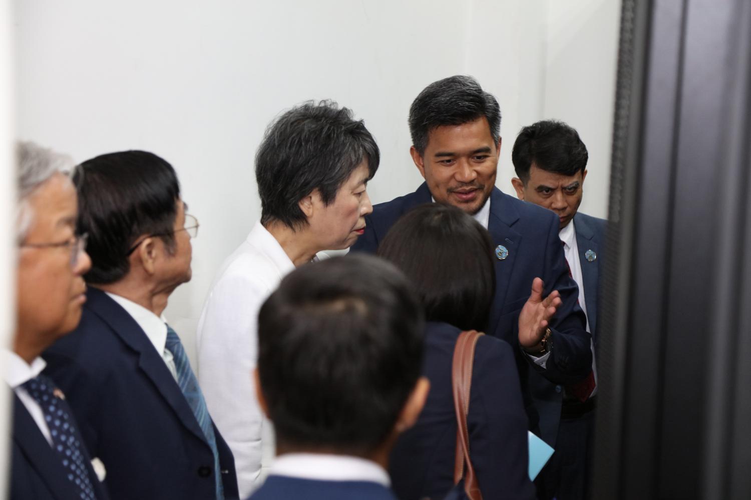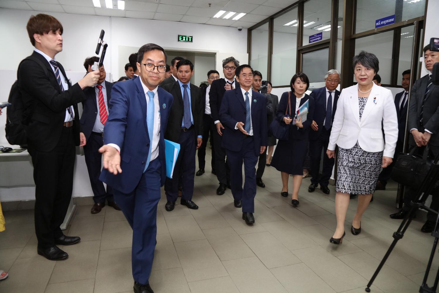 រូបភាពសកម្មភាព ឯកឧត្ដម តុប ឫទ្ធី អគ្គនាយកនៃអគ្គនាយកដ្ឋានសេវាកម្មច្បាប់ និងបច្ចេកទេស បានបង្ហាញអំពីម៉ាស៊ីនមេ (Server) និងធ្វើបទបង្ហាញអំពីការចុះឈ្មោះបោះឆ្នោតនៅកម្ពុជា ជូនដល់លោកជំទាវ ខាមីខាវ៉ា យ៉ូកុ (KAMIKAWA Yoko) រដ្ឋមន្ត្រីក្រសួងការបរទេសជប៉ុន និងសហការី នារសៀលថ្ងៃទី៦ ខែកក្កដា ឆ្នាំ២០២៤ នៅទីស្ដីការ គ.ជ.ប
