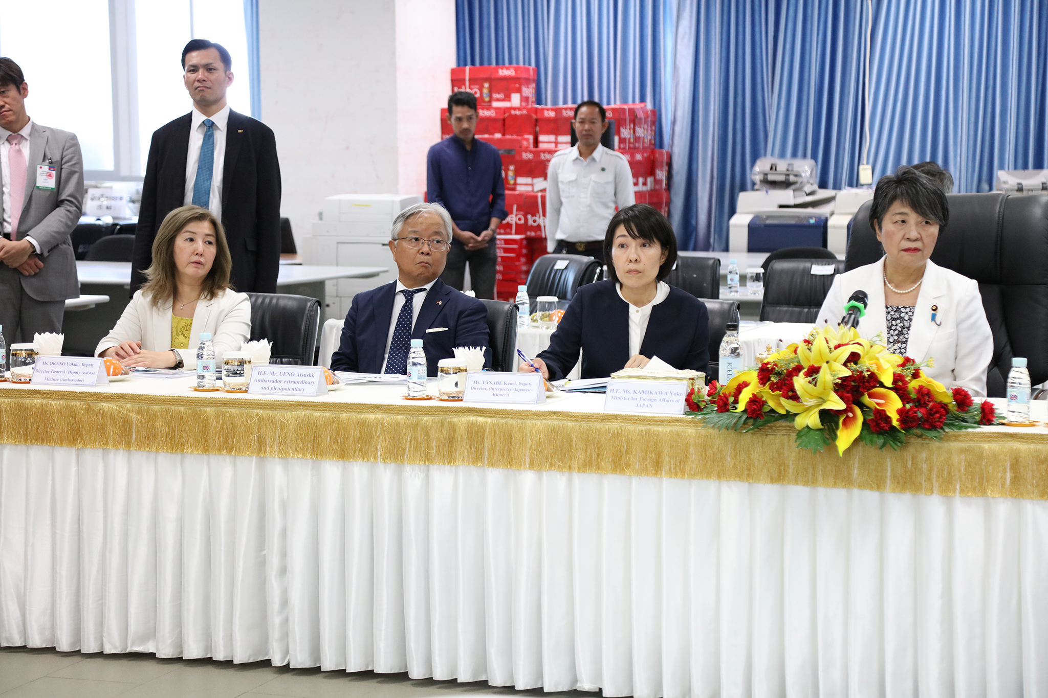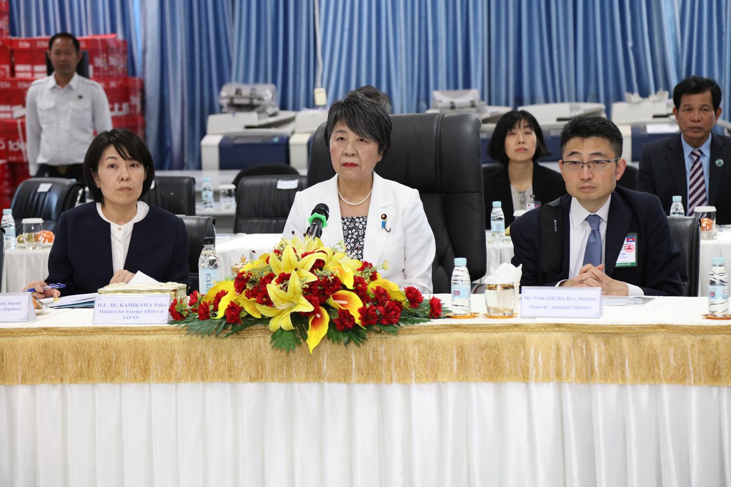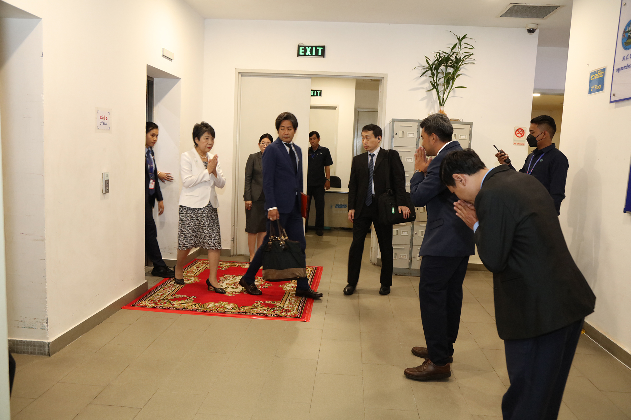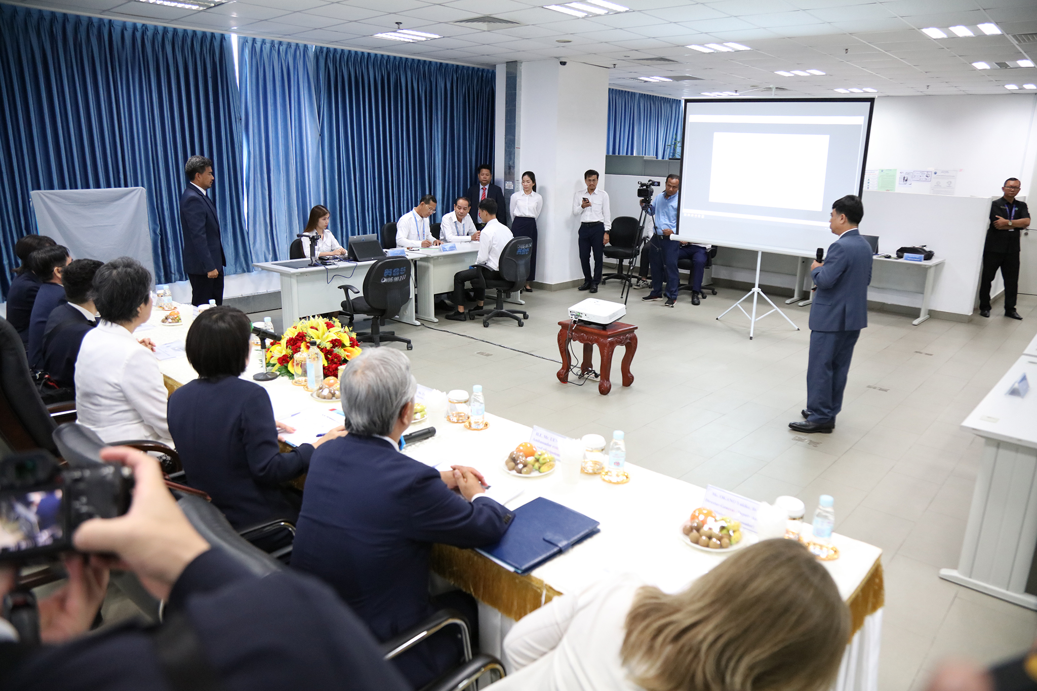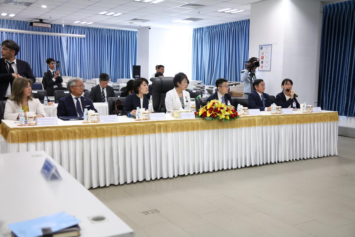 រូបភាពសកម្មភាព ឯកឧត្ដម តុប ឫទ្ធី អគ្គនាយកនៃអគ្គនាយកដ្ឋានសេវាកម្មច្បាប់ និងបច្ចេកទេស បានបង្ហាញអំពីម៉ាស៊ីនមេ (Server) និងធ្វើបទបង្ហាញអំពីការចុះឈ្មោះបោះឆ្នោតនៅកម្ពុជា ជូនដល់លោកជំទាវ ខាមីខាវ៉ា យ៉ូកុ (KAMIKAWA Yoko) រដ្ឋមន្ត្រីក្រសួងការបរទេសជប៉ុន និងសហការី នារសៀលថ្ងៃទី៦ ខែកក្កដា ឆ្នាំ២០២៤ នៅទីស្ដីការ គ.ជ.ប