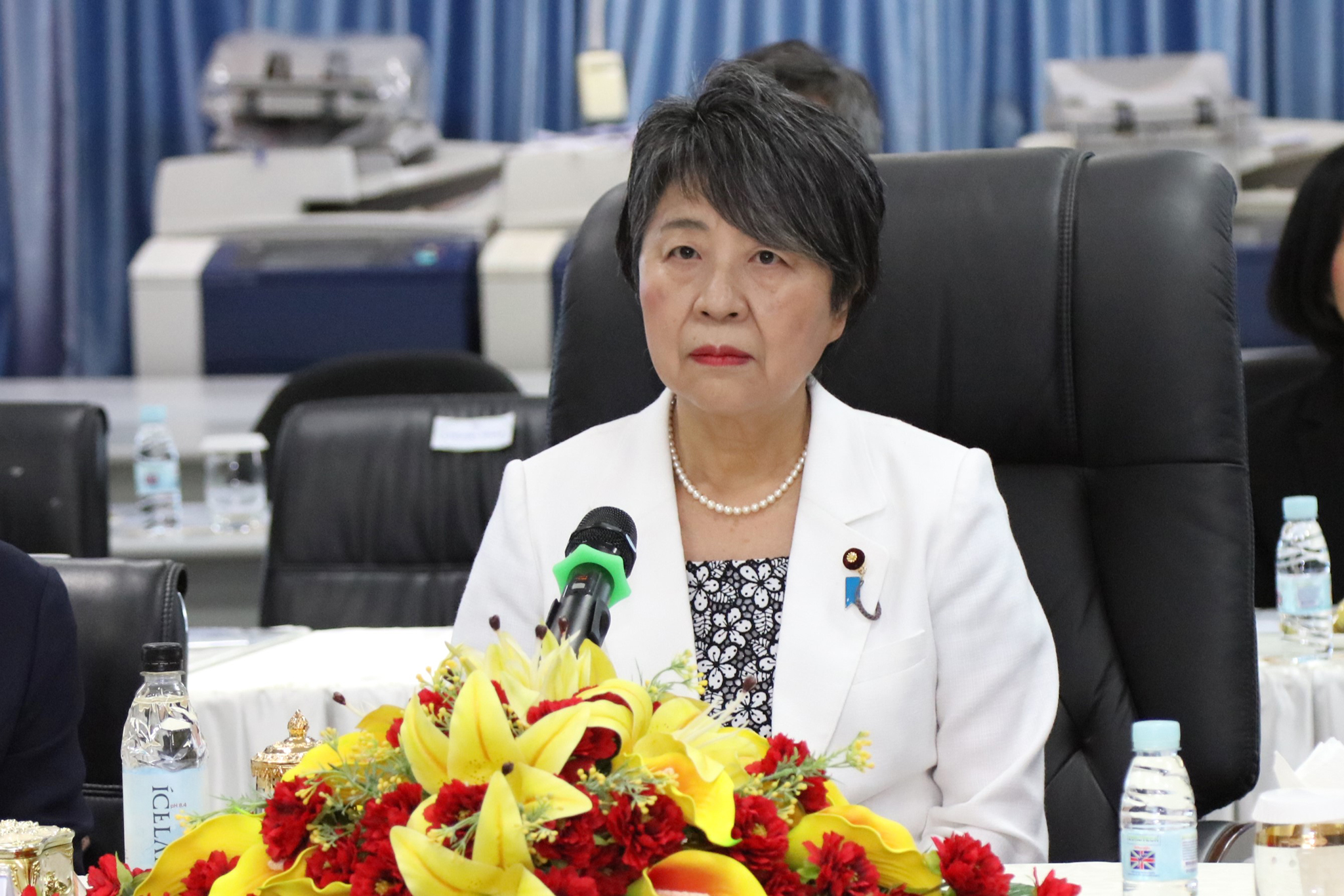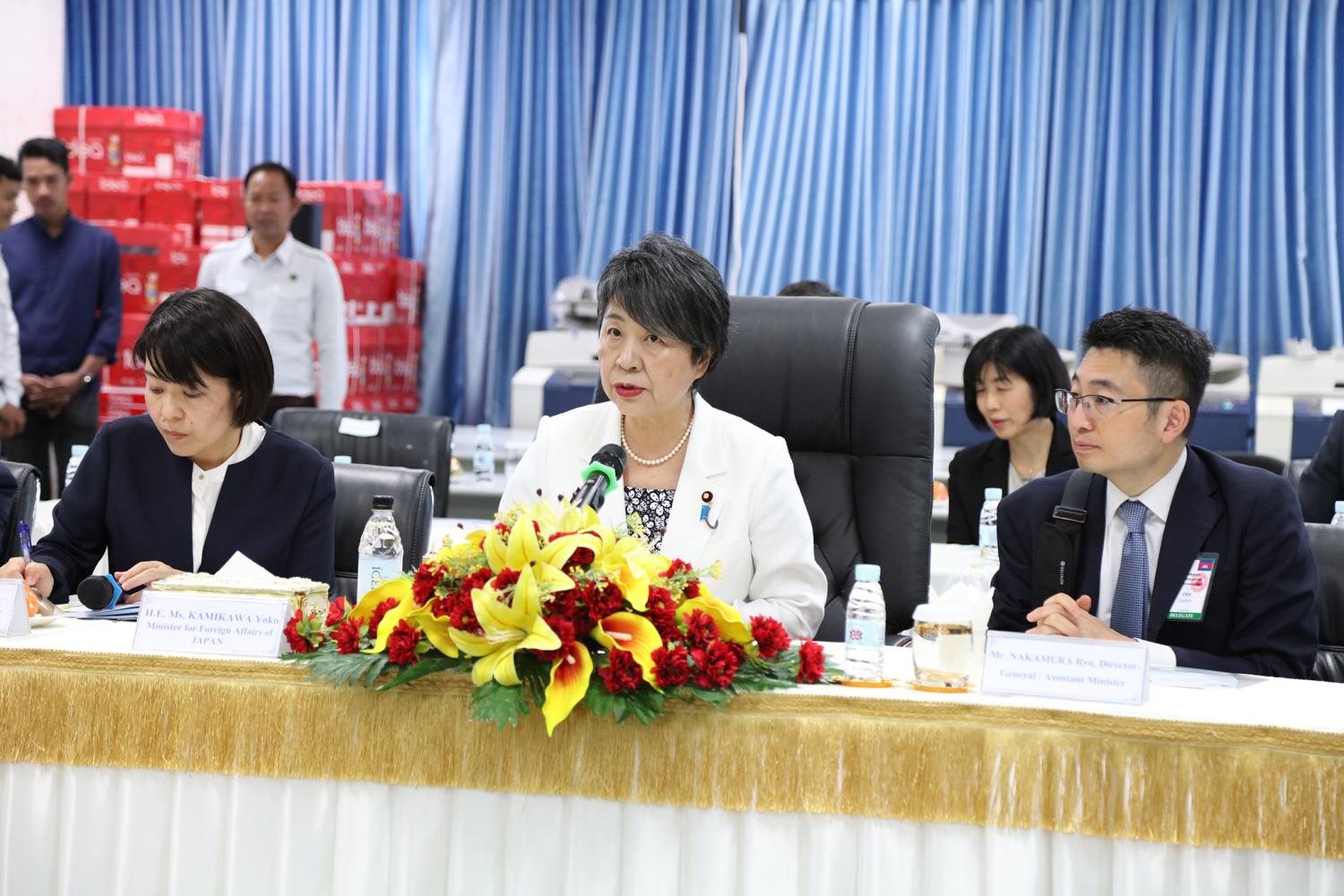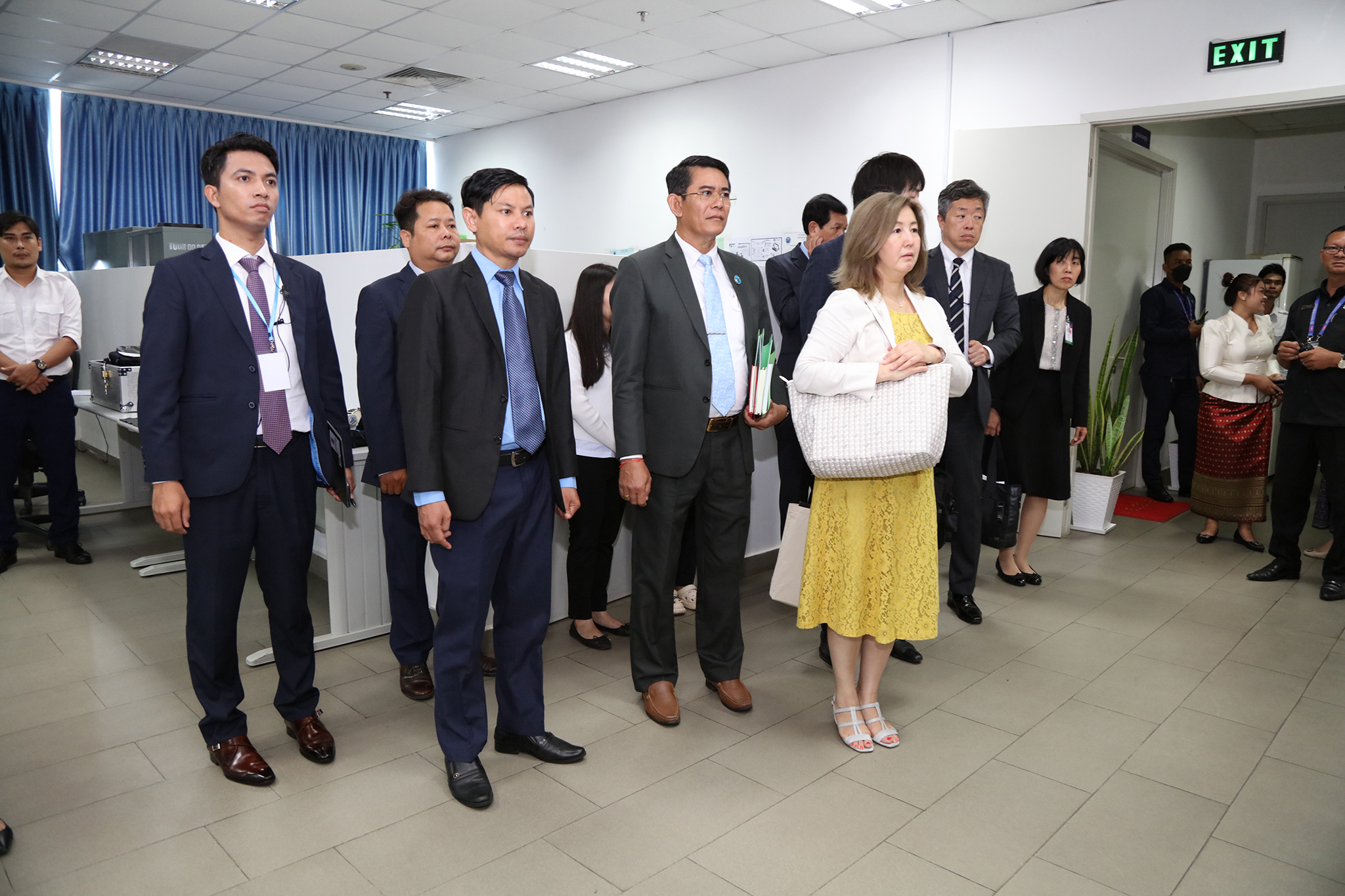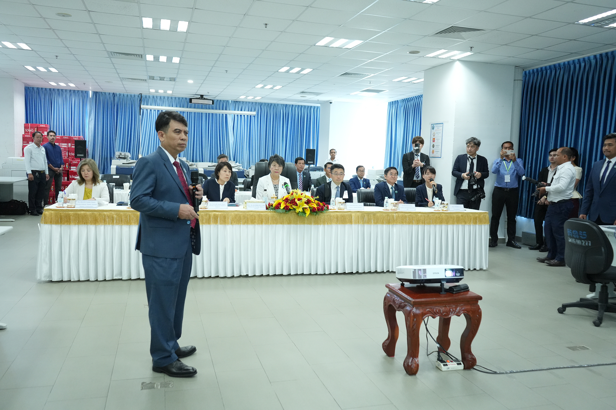 រូបភាពសកម្មភាព ឯកឧត្ដម តុប ឫទ្ធី អគ្គនាយកនៃអគ្គនាយកដ្ឋានសេវាកម្មច្បាប់ និងបច្ចេកទេស បានបង្ហាញអំពីម៉ាស៊ីនមេ (Server) និងធ្វើបទបង្ហាញអំពីការចុះឈ្មោះបោះឆ្នោតនៅកម្ពុជា ជូនដល់លោកជំទាវ ខាមីខាវ៉ា យ៉ូកុ (KAMIKAWA Yoko) រដ្ឋមន្ត្រីក្រសួងការបរទេសជប៉ុន និងសហការី នារសៀលថ្ងៃទី៦ ខែកក្កដា ឆ្នាំ២០២៤ នៅទីស្ដីការ គ.ជ.ប