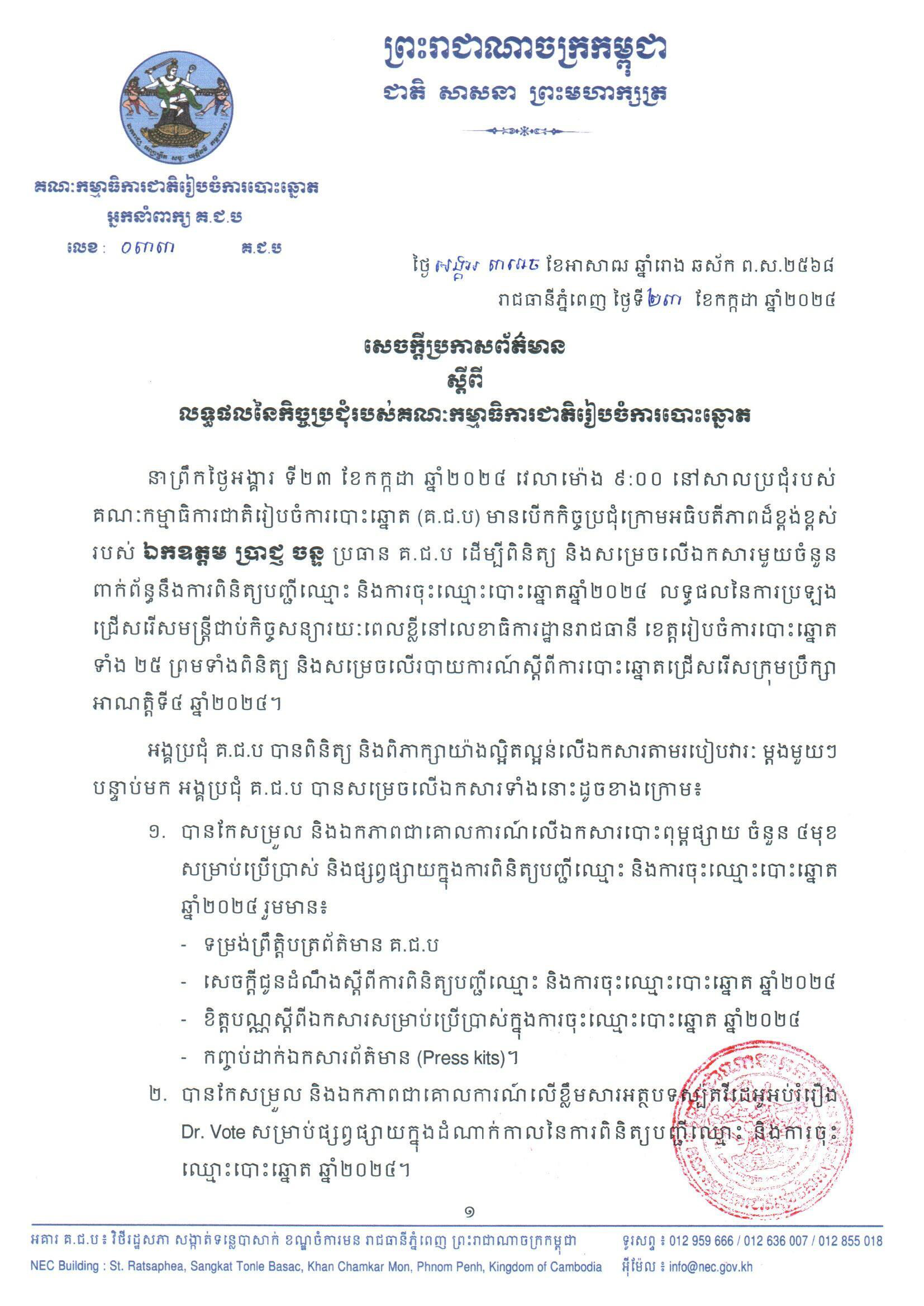 នាព្រឹកថ្ងៃអង្គារ ទី២៣ ខែកក្កដា ឆ្នាំ២០២៤ វេលាម៉ោង ៩:០០ នៅសាលប្រជុំរបស់គណៈកម្មាធិការជាតិរៀបចំការបោះឆ្នោត (គ.ជ.ប) មានបើកកិច្ចប្រជុំក្រោមអធិបតីភាពដ៏ខ្ពង់ខ្ពស់ របស់ ឯកឧត្តម ប្រាជ្ញ ចន្ទ ប្រធាន គ.ជ.ប ដើម្បីពិនិត្យ និងសម្រេចលើឯកសារមួយចំនួន ពាក់ព័ន្ធនឹងការពិនិត្យបញ្ជីឈ្មោះ និងការចុះឈ្មោះបោះឆ្នោតឆ្នាំ២០២៤ លទ្ធផលនៃការប្រឡងជ្រើសរើសមន្រ្តីជាប់កិច្ចសន្យារយៈពេលខ្លីនៅលេខាធិការដ្ឋានរាជធានី ខេត្តរៀបចំការបោះឆ្នោតទាំង ២៥ ព្រមទាំងពិនិត្យ និងសម្រេចលើរបាយការណ៍ស្តីពីការបោះឆ្នោតជ្រើសរើសក្រុមប្រឹក្សា អាណត្តិទី៤ ឆ្នាំ២០២៤។