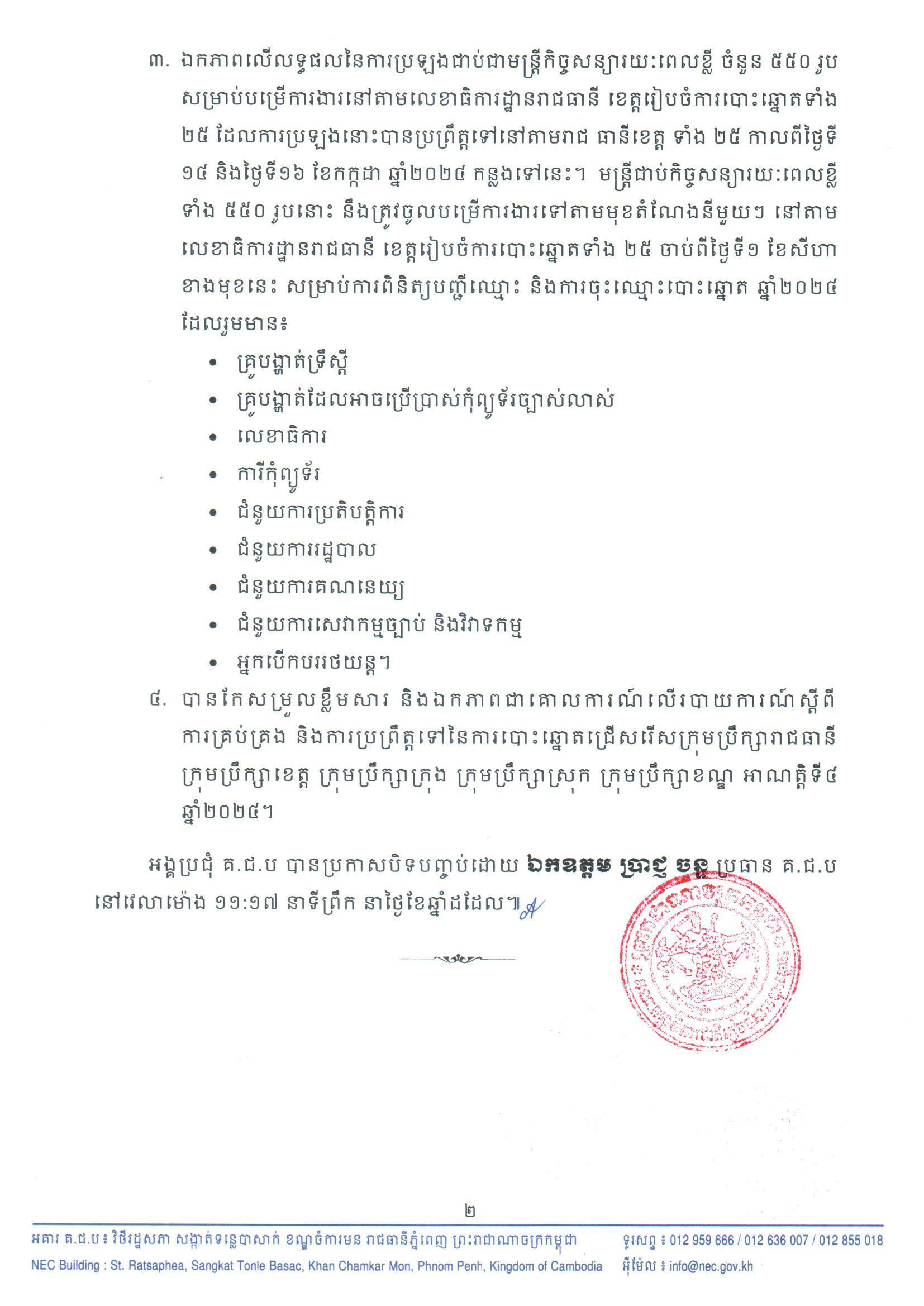 ៣. ឯកភាពលើលទ្ធផលនៃការប្រឡងជាប់ជាមន្ត្រីកិច្ចសន្យារយៈពេលខ្លី ចំនួន ៥៥០ រូប សម្រាប់បម្រើការងារនៅតាមលេខាធិការដ្ឋានរាជធានី ខេត្តរៀបចំការបោះឆ្នោតទាំង ២៥ ដែលការប្រឡងនោះបានប្រព្រឹត្តទៅនៅតាមរាជ ធានីខេត្ត ទាំង ២៥ កាលពីថ្ងៃទី ១៤ និងថ្ងៃទី១៦ ខែកក្កដា ឆ្នាំ២០២៤ កន្លងទៅនេះ។ មន្ត្រីជាប់កិច្ចសន្យារយៈពេលខ្លីទាំង ៥៥០ រូបនោះ នឹងត្រូវចូលបម្រើការងារទៅតាមមុខតំណែងនីមួយៗ នៅតាមលេខាធិការដ្ឋានរាជធានី ខេត្តរៀបចំការបោះឆ្នោតទាំង ២៥ ចាប់ពីថ្ងៃទី១ ខែសីហា ខាងមុខនេះ សម្រាប់ការពិនិត្យបញ្ជីឈ្មោះ និងការចុះឈ្មោះបោះឆ្នោត ឆ្នាំ២០២៤ ដែលរួមមាន៖