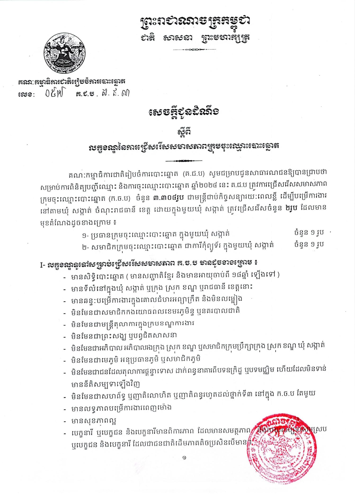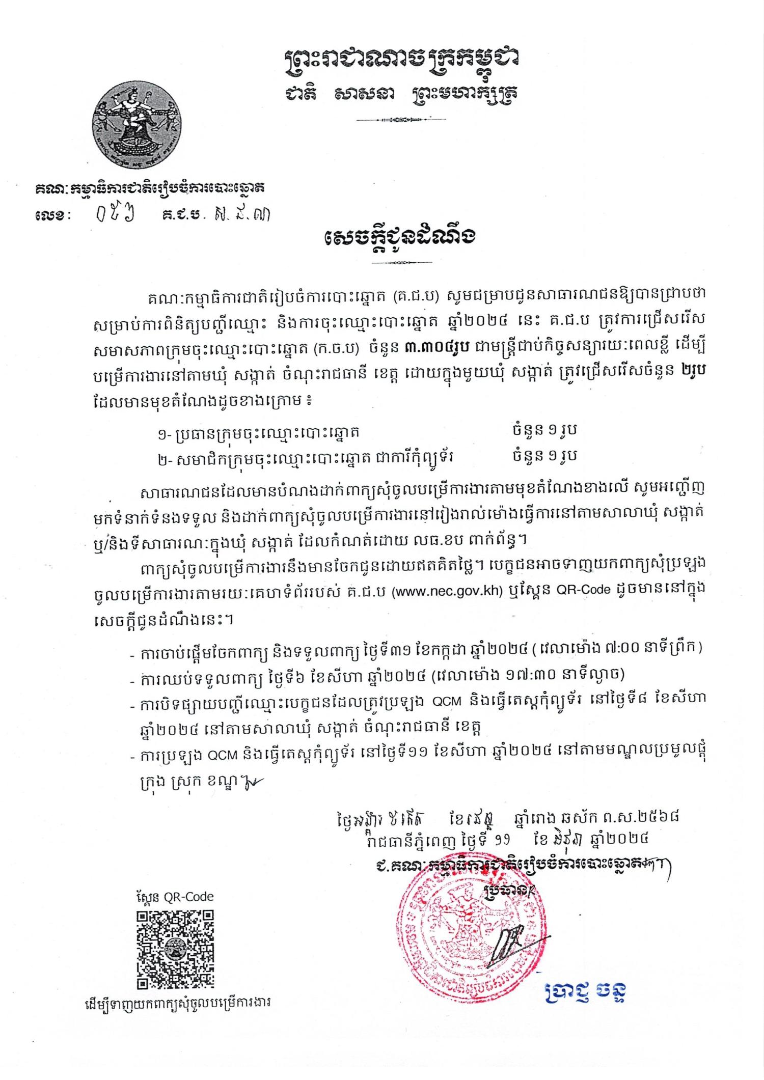 Download សេចក្ដីជូនដំណឹង គ.ជ.ប ត្រូវការជ្រើសរើសសមាសភាពក្រុមចុះឈ្មោះបោះឆ្នោត (ក.ច.ប)6.52 MB ទម្រង់ពាក្យសុំចូលបម្រើការងារ2.56 MB