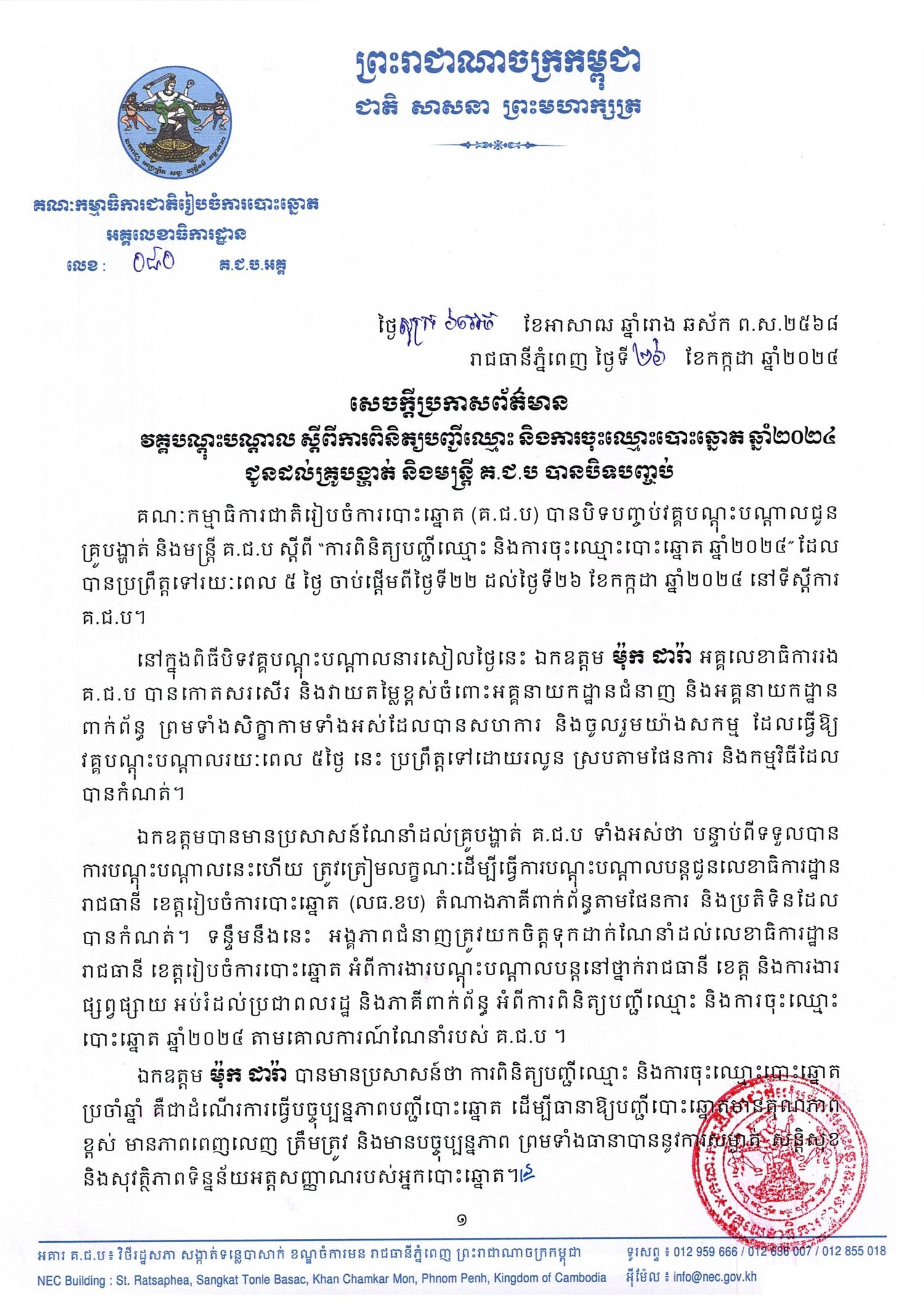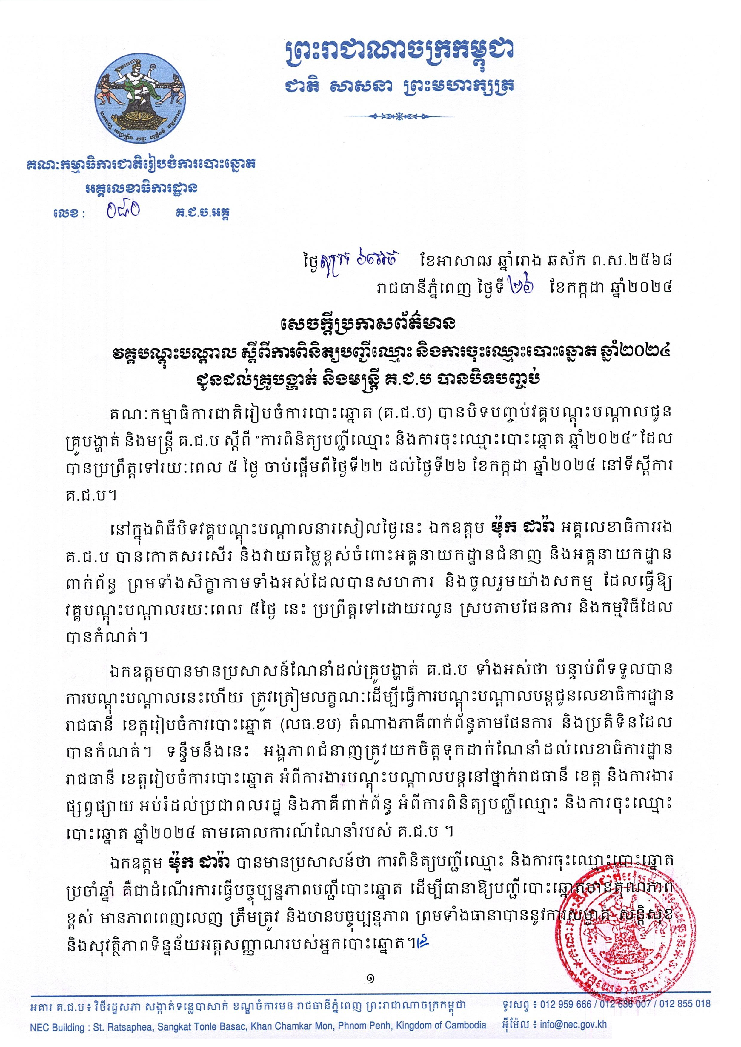 សូមជម្រាបជូនថា វគ្គបណ្ដុះបណ្ដាល ស្ដីពី “ការពិនិត្យបញ្ជីឈ្មោះ និងការចុះឈ្មោះបោះឆ្នោត ឆ្នាំ២០២៤” នឹងត្រូវរៀបចំនៅថ្នាក់ គ.ជ.ប ចំនួន ១ លើកទៀត សម្រាប់ លធ.ខប និងតំណាងភាគីពាក់ព័ន្ធ នៅថ្ងៃទី១៥-១៧ ខែសីហា ឆ្នាំ២០២៤ មុននឹងបន្តរៀបចំនៅថ្នាក់រាជធានី ខេត្ត នៅថ្ងៃទី១៩-២០ ខែសីហា ឆ្នាំ២០២៤ សម្រាប់រាជធានី ខេត្ត ចំនួន ១៣ និងនៅថ្ងៃទី២២-២៣ ខែសីហា ឆ្នាំ២០២៤ សម្រាប់ខេត្តចំនួន ១២ ទៀត៕
