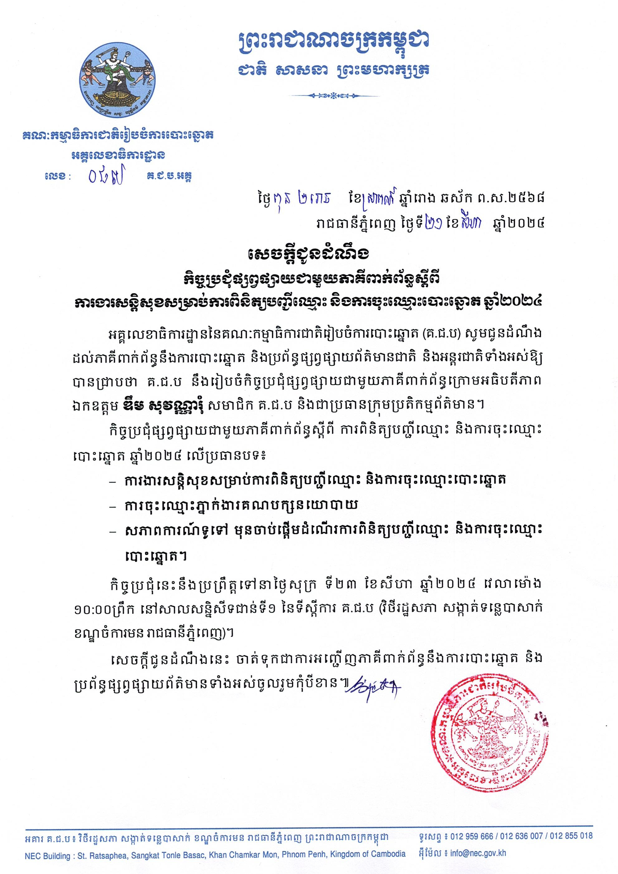 កិច្ចប្រជុំនេះនឹងប្រព្រឹត្តទៅនាថ្ងៃសុក្រ ទី២៣ ខែសីហា ឆ្នាំ២០២៤ វេលាម៉ោង ១០:០០ព្រឹក នៅសាលសន្និសីទជាន់ទី១ នៃទីស្តីការ គ.ជ.ប (វិថីរដ្ឋសភា សង្កាត់ទន្លេបាសាក់ ខណ្ឌចំការមន រាជធានីភ្នំពេញ)។