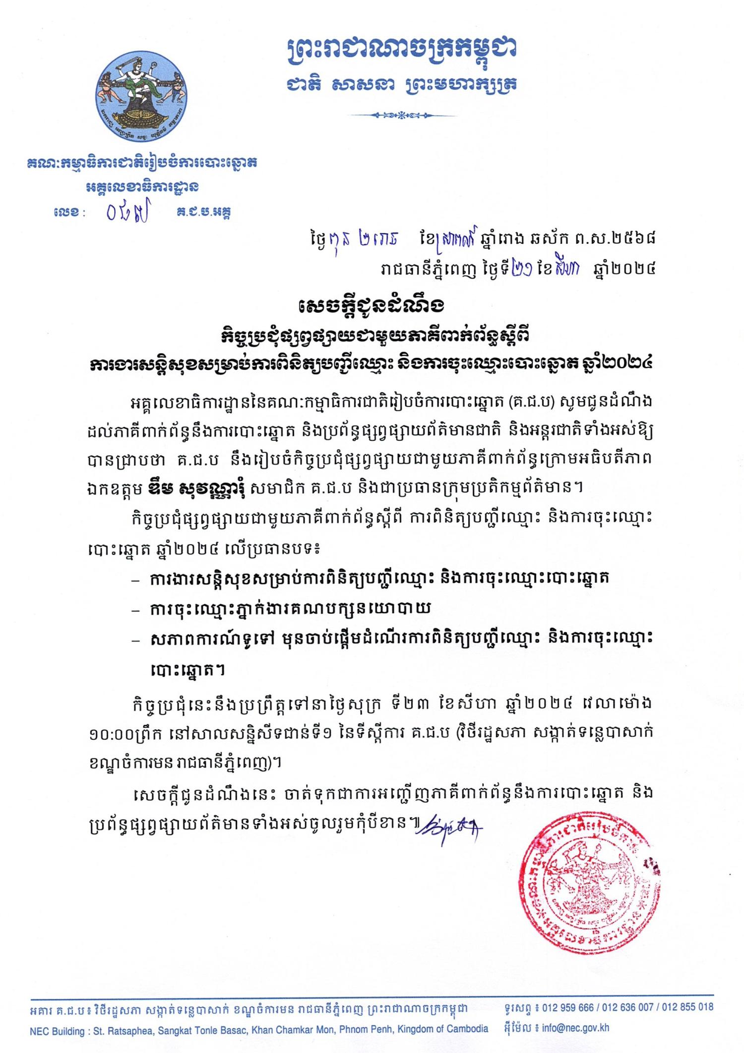 អគ្គលេខាធិការដ្ឋាននៃគណៈកម្មាធិការជាតិរៀបចំការបោះឆ្នោត (គ.ជ.ប) សូមជូនដំណឹងដល់ភាគីពាក់ព័ន្ធនឹងការបោះឆ្នោត និងប្រព័ន្ធផ្សព្វផ្សាយព័ត៌មានជាតិ និងអន្តរជាតិទាំងអស់ឱ្យបានជ្រាបថា គ.ជ.ប នឹងរៀបចំកិច្ចប្រជុំផ្សព្វផ្សាយជាមួយភាគីពាក់ព័ន្ធក្រោមអធិបតីភាព ឯកឧត្តម ឌឹម សុវណ្ណារុំ សមាជិក គ.ជ.ប និងជាប្រធានក្រុមប្រតិកម្មព័ត៌មាន។