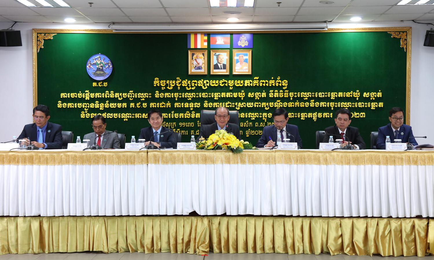 ឯកឧត្តម មាន សទិ សមាជិក គ.ជ.ប បានដឹកនាំកិច្ចប្រជុំផ្សព្វផ្សាយជាមួយភាគីពាក់ព័ន្ធ ស្ដីពីការចាប់ផ្តើមការពិនិត្យបញ្ជីឈ្មោះ និងការចុះឈ្មោះបោះឆ្នោតតាមឃុំ សង្កាត់ នីតិវិធីចុះឈ្មោះបោះឆ្នោតនៅឃុំ សង្កាត់ និងការបញ្ជូនទិន្នន័យមក គ.ជ.ប ការដាក់ ការទទួល និងការដោះស្រាយពាក្យបណ្តឹងទាក់ទងនឹងការចុះឈ្មោះបោះឆ្នោត និងលទ្ធផលបណ្តោះអាសន្ននៃការចែកលិខិតអញ្ជើញអ្នកមានឈ្មោះក្នុងបញ្ជីបោះឆ្នោតផ្លូវការ ឆ្នាំ២០២៣ សម្រាប់បម្រើឱ្យការពិនិត្យបញ្ជីឈ្មោះ និងការចុះឈ្មោះបោះឆ្នោត ឆ្នាំ២០២៤ នៅទីស្ដីការ គ.ជ.ប នាព្រឹកថ្ងៃទី៣០ ខែសីហា ឆ្នាំ២០២៤។