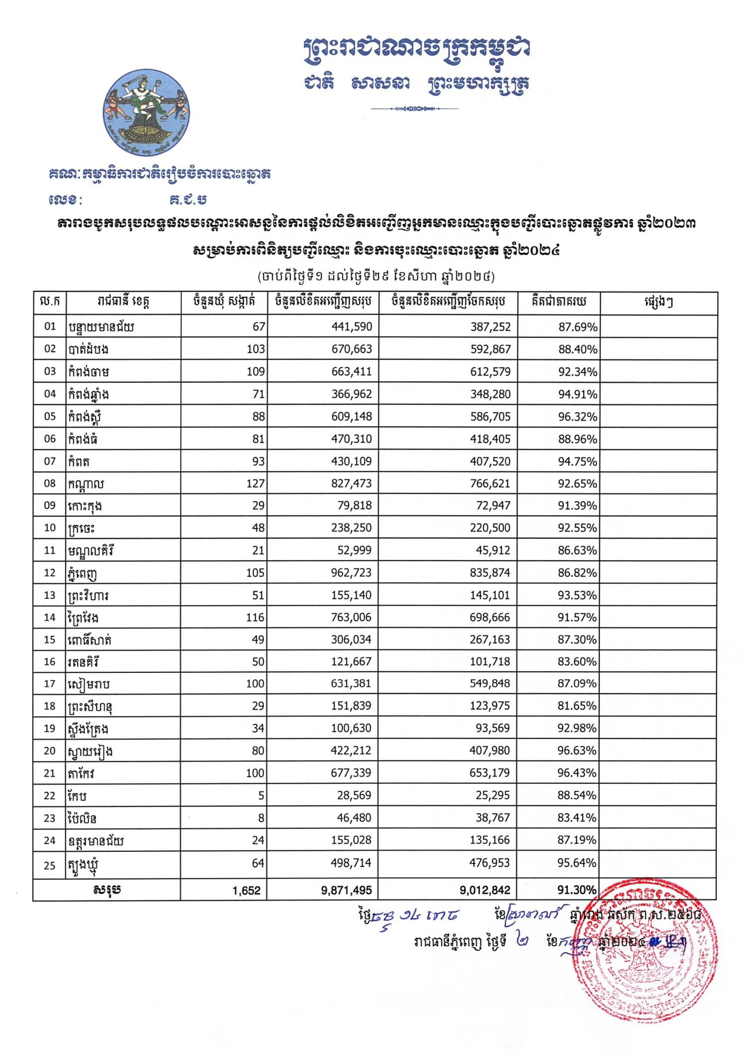 តារាងបូកសរុបលទ្ធផលបណ្តោះអាសន្ននៃការផ្តល់លិខិតអញ្ជើញអ្នកមានឈ្មោះក្នុងបញ្ជីបោះឆ្នោតផ្លូវការ ឆ្នាំ២០២៣ សម្រាប់ការពិនិត្យបញ្ជីឈ្មោះ និងការចុះឈ្មោះបោះឆ្នោត ឆ្នាំ២០២៤ (ចាប់ពីថ្ងៃទី១ ដល់ថ្ងៃទី២៩ ខែសីហា ឆ្នាំ២០២៤)