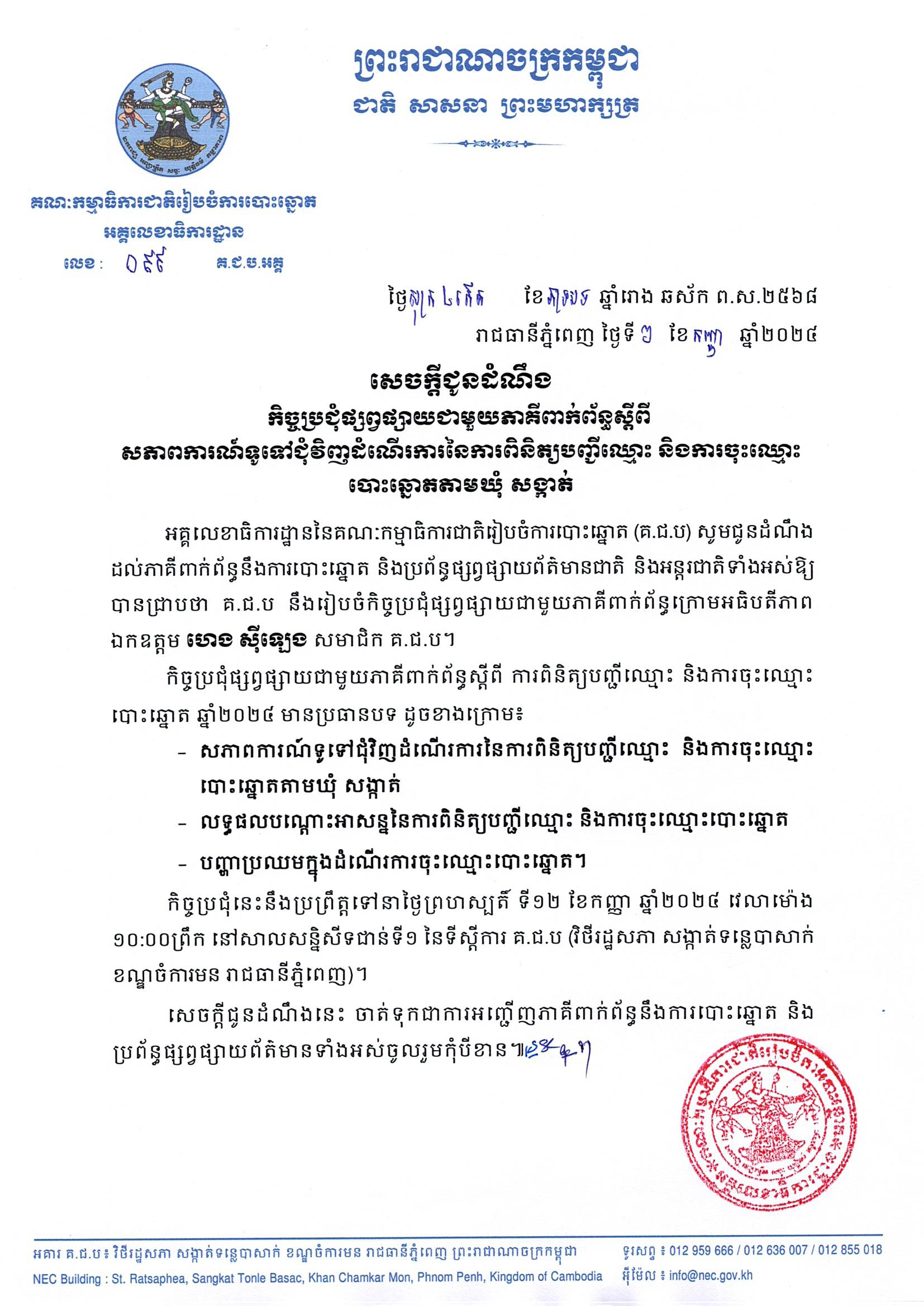 កិច្ចប្រជុំនេះនឹងប្រព្រឹត្តទៅនាថ្ងៃព្រហស្បតិ៍ ទី១២ ខែកញ្ញា ឆ្នាំ២០២៤ វេលាម៉ោង ១០:០០ព្រឹក នៅសាលសន្និសីទជាន់ទី១ នៃទីស្តីការ គ.ជ.ប (វិថីរដ្ឋសភា សង្កាត់ទន្លេបាសាក់ ខណ្ឌចំការមន រាជធានីភ្នំពេញ)។