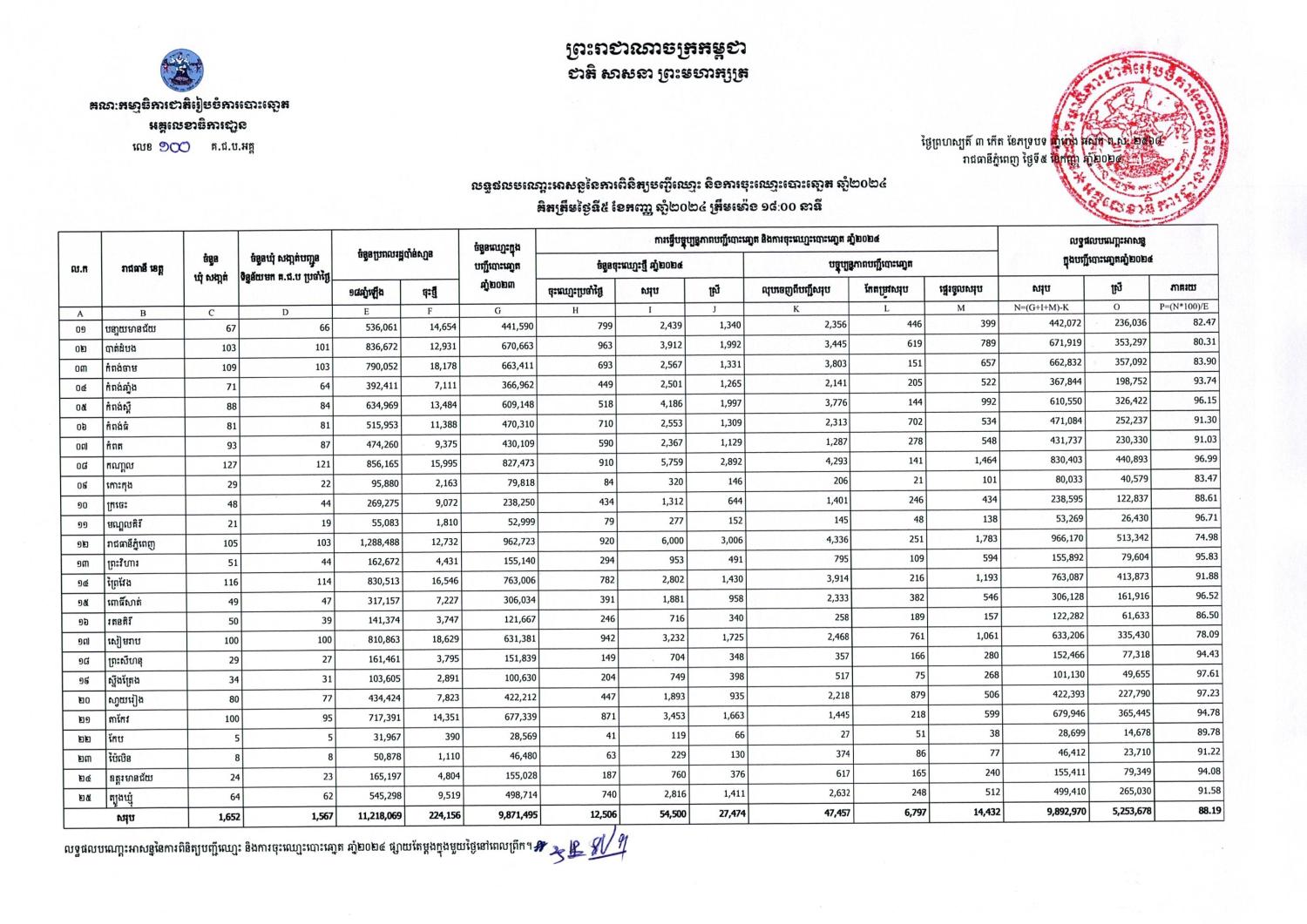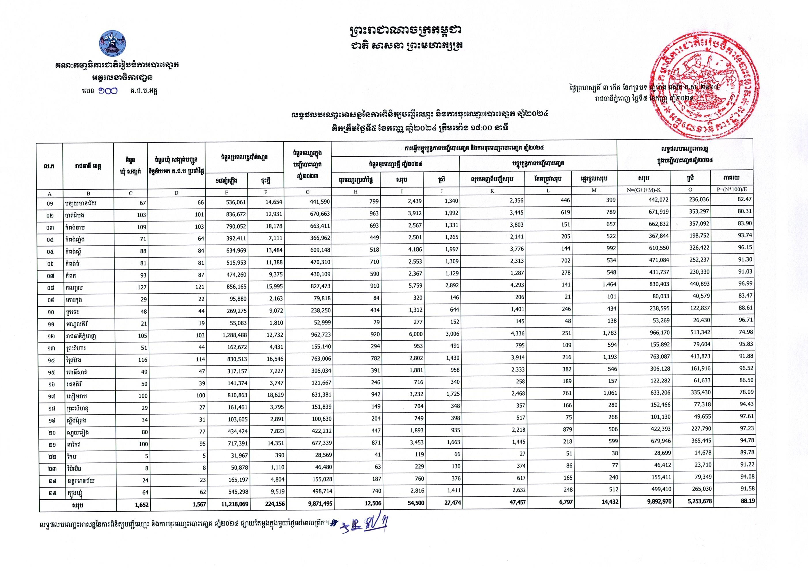 តារាងលទ្ធផលបណ្តោះអាសន្ននៃការពិនិត្យបញ្ជីឈ្មោះ និងការចុះឈ្មោះបោះឆ្នោត ឆ្នាំ២០២៤ គិតត្រឹមថ្ងៃទី៥ ខែកញ្ញា ឆ្នាំ២០២៤ ត្រឹមម៉ោង ១៨:០០ នាទី