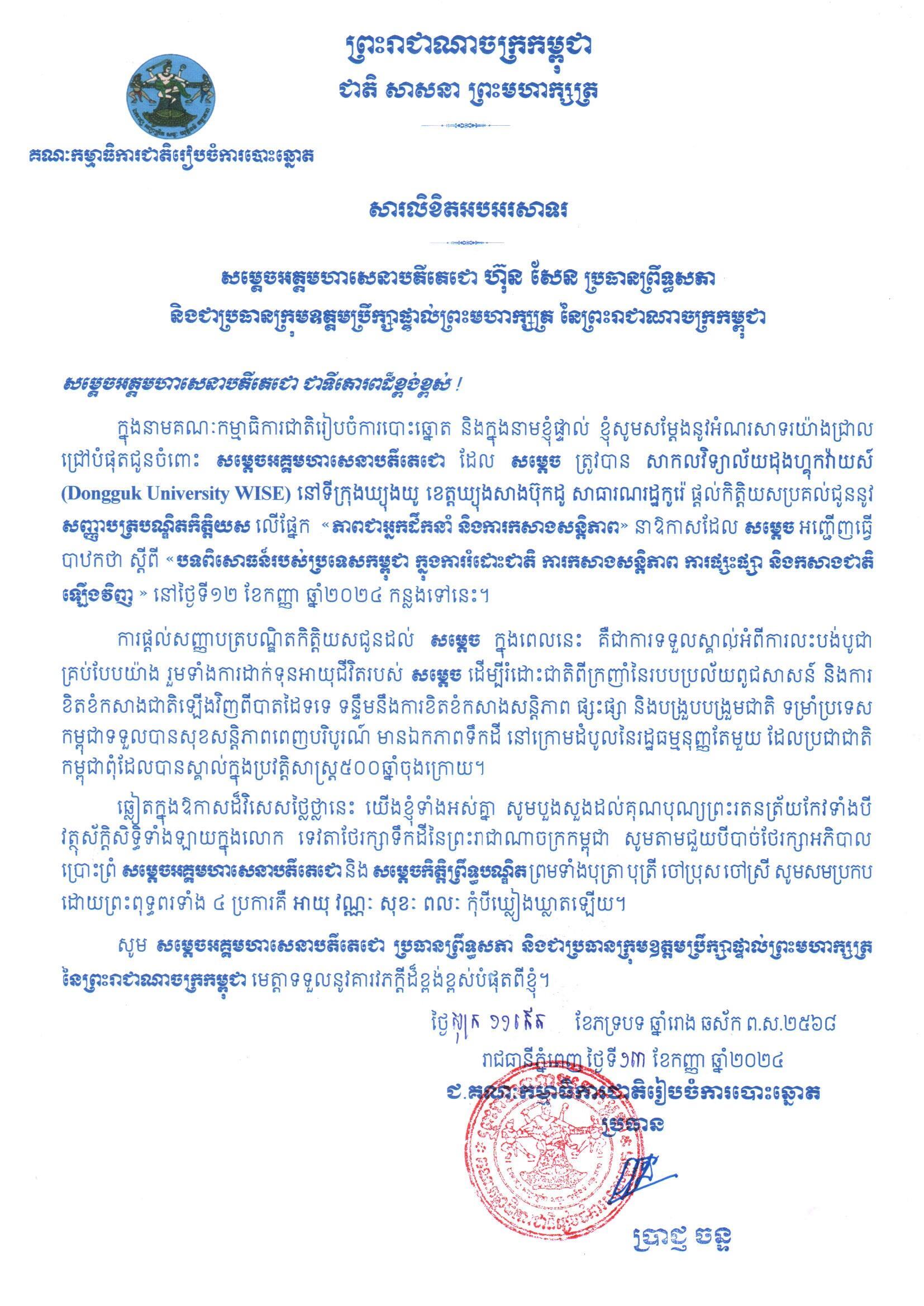 សារលិខិតអបអរសាទរ គោរពជូនសម្តេចអគ្គមហាសេនាបតីតេជោ ហ៊ុន សែន ប្រធានព្រឹទ្ធសភា និងជាប្រធានក្រុមឧត្តមប្រឹក្សាផ្ទាល់ព្រះមហាក្សត្រ នៃព្រះរាជាណាចក្រកម្ពុជា ក្នុងឱកាសទទួលសញ្ញាបត្របណ្ឌិតកិត្តិយស “ភាពជាអ្នកដឹកនាំ និងការកសាងសន្តិភាព” ពីសាកលវិទ្យាល័យ ដុងហ្គុកវ៉ាយស៍ ( Dongguk Wise University ) នៃសាធារណរដ្ឋកូរ៉េ