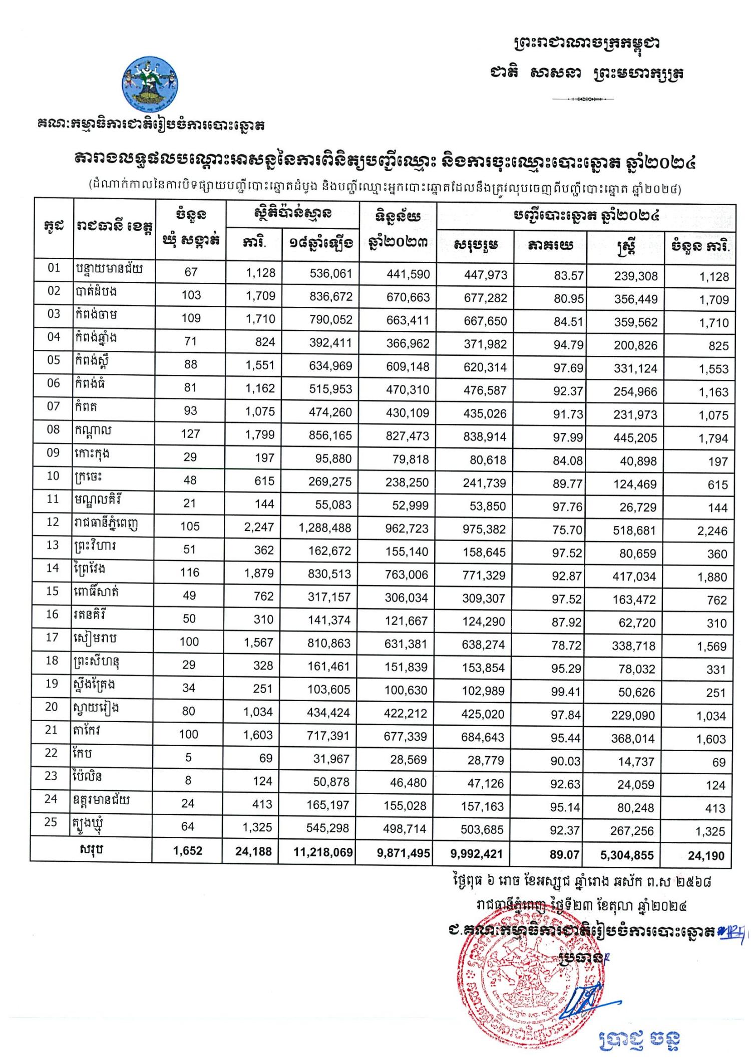 តារាងលទ្ធផលបណ្តោះអាសន្ននៃការពិនិត្យបញ្ជីឈ្មោះ និងការចុះឈ្មោះបោះឆ្នោត ឆ្នាំ២០២៤ ក្នុងដំណាក់កាលនៃការបិទផ្សាយបញ្ជីបោះឆ្នោតដំបូង និងបញ្ជីឈ្មោះអ្នកបោះឆ្នោតដែលនឹងត្រូវលុបចេញពីបញ្ជីបោះឆ្នោត ឆ្នាំ២០២៤