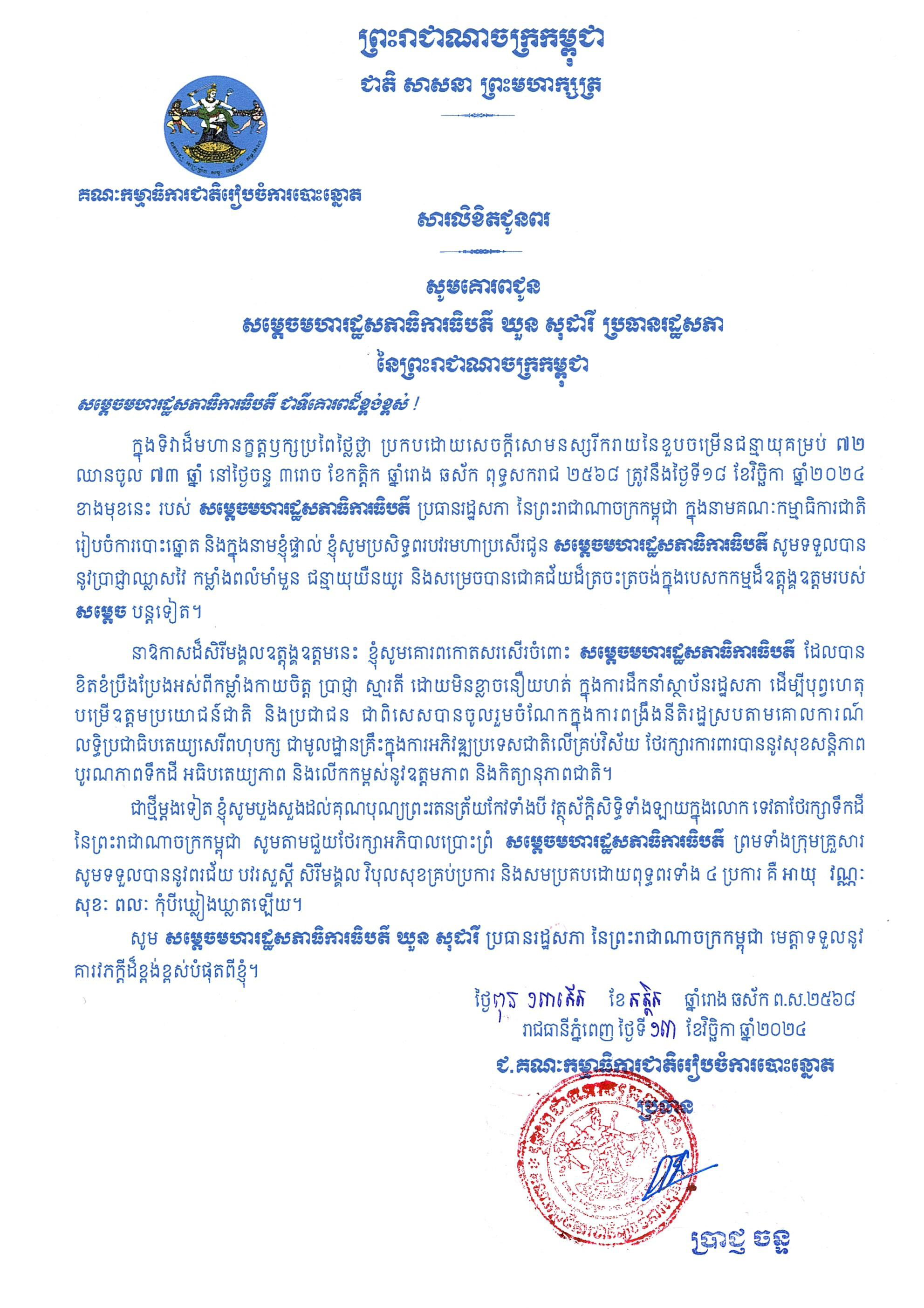 សារលិខិតជូនពរ សម្ដេចមហារដ្ឋសភាធិការធិបតី ឃួន សុដារី ប្រធានរដ្ឋសភា នៃព្រះរាជាណាចក្រកម្ពុជា ក្នុងទិវាដ៏មហានក្ខត្តឫក្សប្រពៃថ្លៃថ្លា ប្រកបដោយសេចក្ដីសោមនស្សរីករាយនៃខួបចម្រើនជន្មាយុគម្រប់ ៧២ ឈានចូល ៧៣ ឆ្នាំ