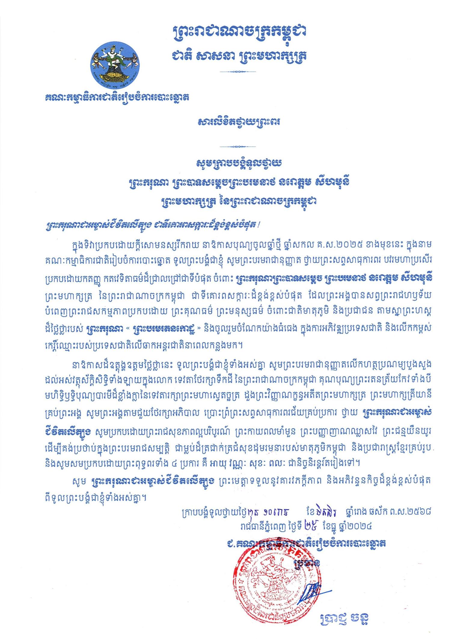 សារលិខិតថ្វាយព្រះពរ ព្រះករុណា ព្រះបាទសម្តេចព្រះបរមនាថ នរោត្តម សីហមុនី ព្រះមហាក្សត្រ នៃព្រះរាជាណាចក្រកម្ពុជា ក្នុងទិវាប្រកបដោយក្តីសោមនស្សរីករាយ នាឱកាសបុណ្យចូលឆ្នាំថ្មី ឆ្នាំសកល គ.ស.២០២៥