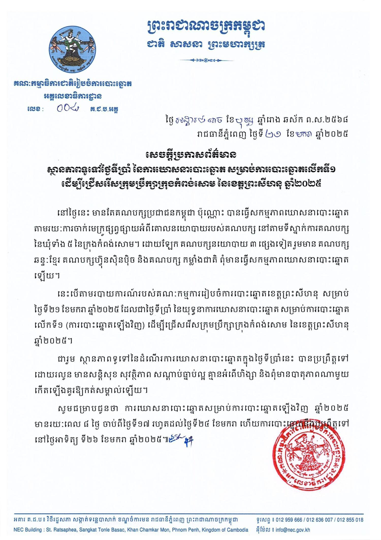នេះបើតាមរបាយការណ៍របស់គណៈកម្មការរៀបចំការបោះឆ្នោតខេត្តព្រះសីហនុ សម្រាប់ថ្ងៃទី២១ ខែមករា ឆ្នាំ២០២៥ ដែលជាថ្ងៃទីប្រាំ នៃយុទ្ធនាការឃោសនាបោះឆ្នោត សម្រាប់ការបោះឆ្នោតលើកទី១ (ការបោះឆ្នោតឡើងវិញ) ដើម្បីជ្រើសរើសក្រុមប្រឹក្សាក្រុងកំពង់សោម នៃខេត្តព្រះសីហនុ ឆ្នាំ២០២៥។