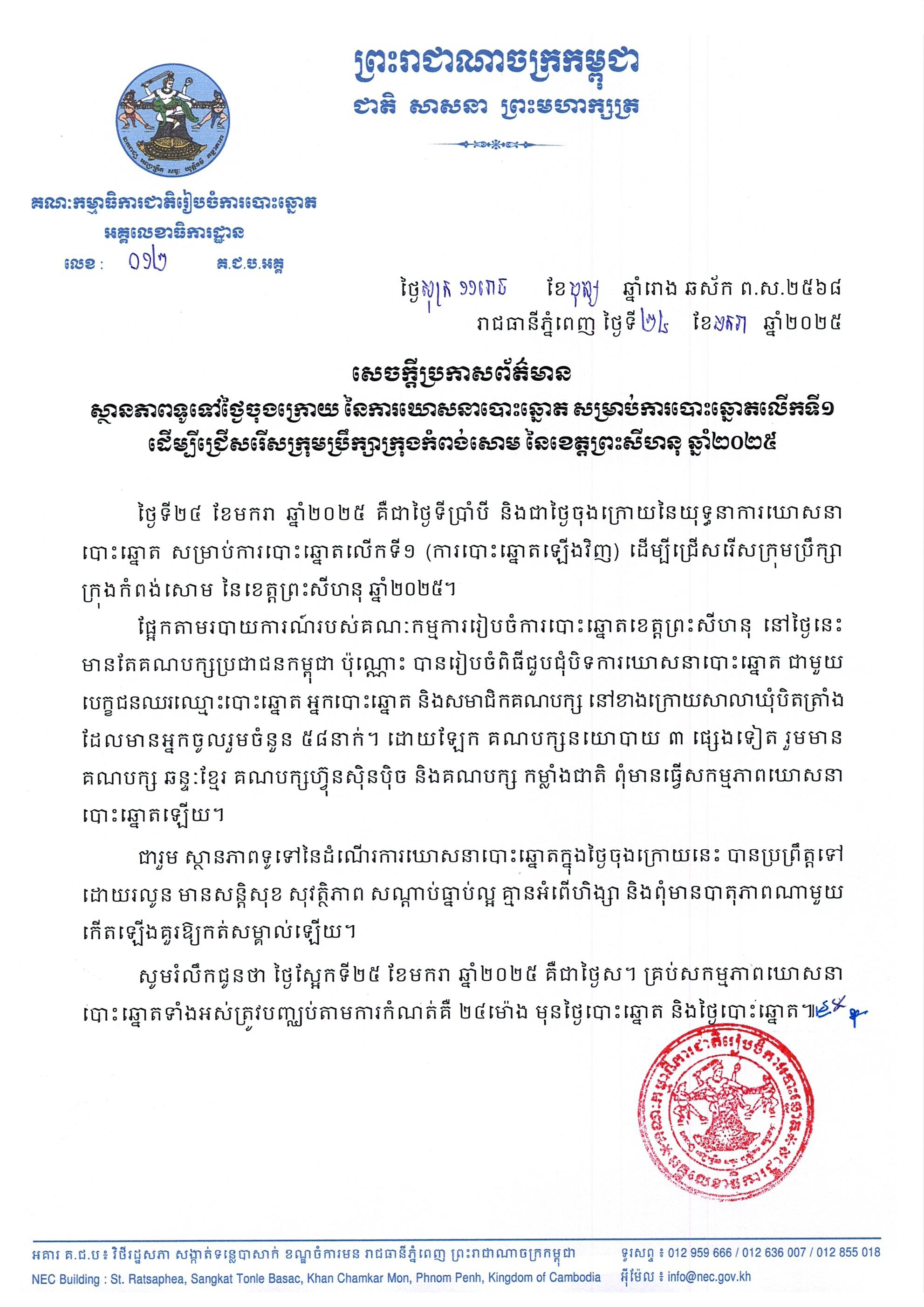 សូមរំលឹកជូនថា ថ្ងៃស្អែកទី២៥ ខែមករា ឆ្នាំ២០២៥ គឺជាថ្ងៃស។ គ្រប់សកម្មភាពឃោសនាបោះឆ្នោតទាំងអស់ត្រូវបញ្ឈប់តាមការកំណត់គឺ ២៤ម៉ោង មុនថ្ងៃបោះឆ្នោត និងថ្ងៃបោះឆ្នោត៕
