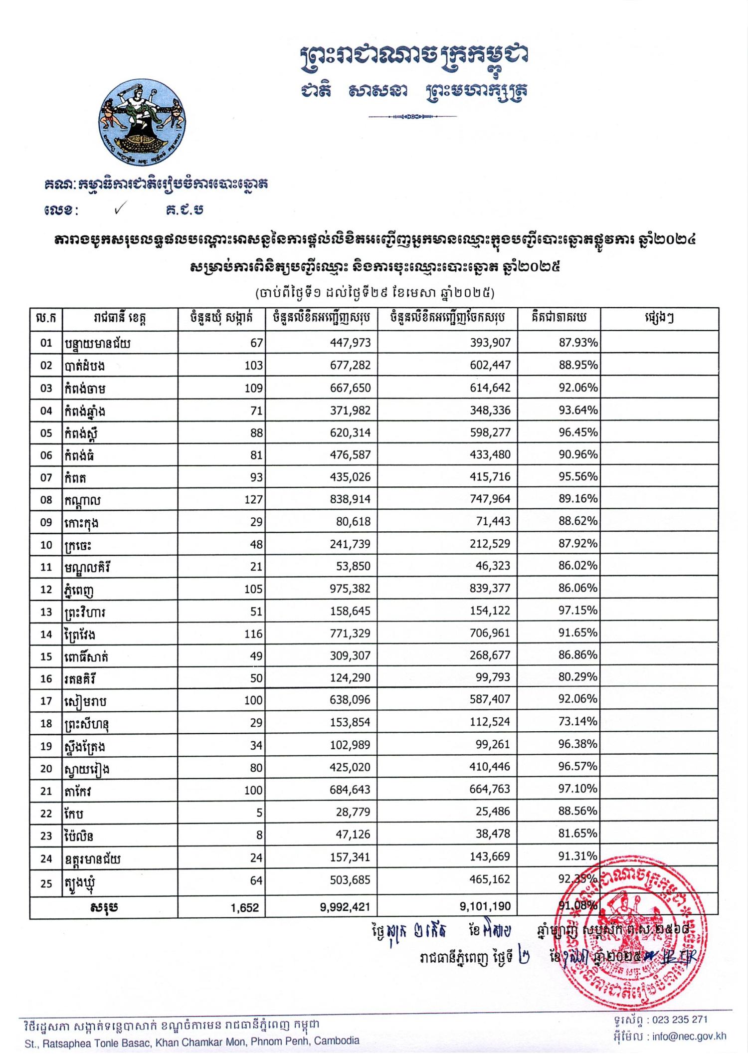 តារាងបូកសរុបលទ្ធផលបណ្តោះអាសន្ននៃការផ្តល់លិខិតអញ្ជើញអ្នកមានឈ្មោះក្នុងបញ្ជីបោះឆ្នោតផ្លូវការ ឆ្នាំ២០២៤ សម្រាប់ការពិនិត្យបញ្ជីឈ្មោះ និងការចុះឈ្មោះបោះឆ្នោត ឆ្នាំ២០២៥ (ចាប់ពីថ្ងៃទី១ ដល់ថ្ងៃទី២៩ ខែមេសា ឆ្នាំ២០២៥)