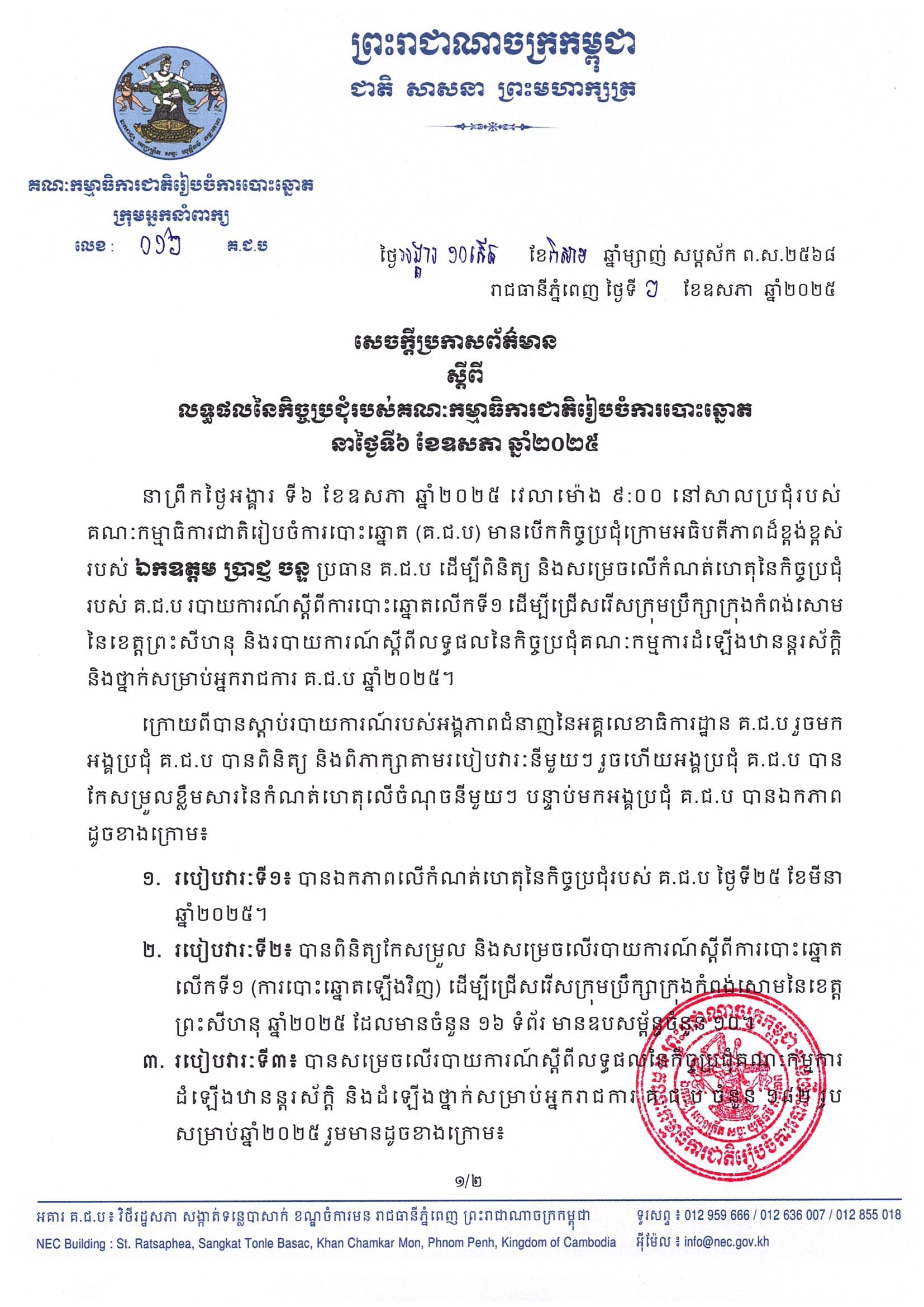 នាព្រឹកថ្ងៃអង្គារ ទី៦ ខែឧសភា ឆ្នាំ២០២៥ វេលាម៉ោង ៩:០០ នៅសាលប្រជុំរបស់ គណៈកម្មាធិការជាតិរៀបចំការបោះឆ្នោត (គ.ជ.ប) មានបើកកិច្ចប្រជុំក្រោមអធិបតីភាពដ៏ខ្ពង់ខ្ពស់របស់ ឯកឧត្តម ប្រាជ្ញ ចន្ទ ប្រធាន គ.ជ.ប ដើម្បីពិនិត្យ និងសម្រេចលើកំណត់ហេតុនៃកិច្ចប្រជុំរបស់ គ.ជ.ប របាយការណ៍ស្តីពីការបោះឆ្នោតលើកទី១ ដើម្បីជ្រើសរើសក្រុមប្រឹក្សាក្រុងកំពង់សោម នៃខេត្តព្រះសីហនុ និងរបាយការណ៍ស្តីពីលទ្ធផលនៃកិច្ចប្រជុំគណៈកម្មការដំឡើងឋានន្តរស័ក្តិ និងថ្នាក់សម្រាប់អ្នករាជការ គ.ជ.ប ឆ្នាំ២០២៥។