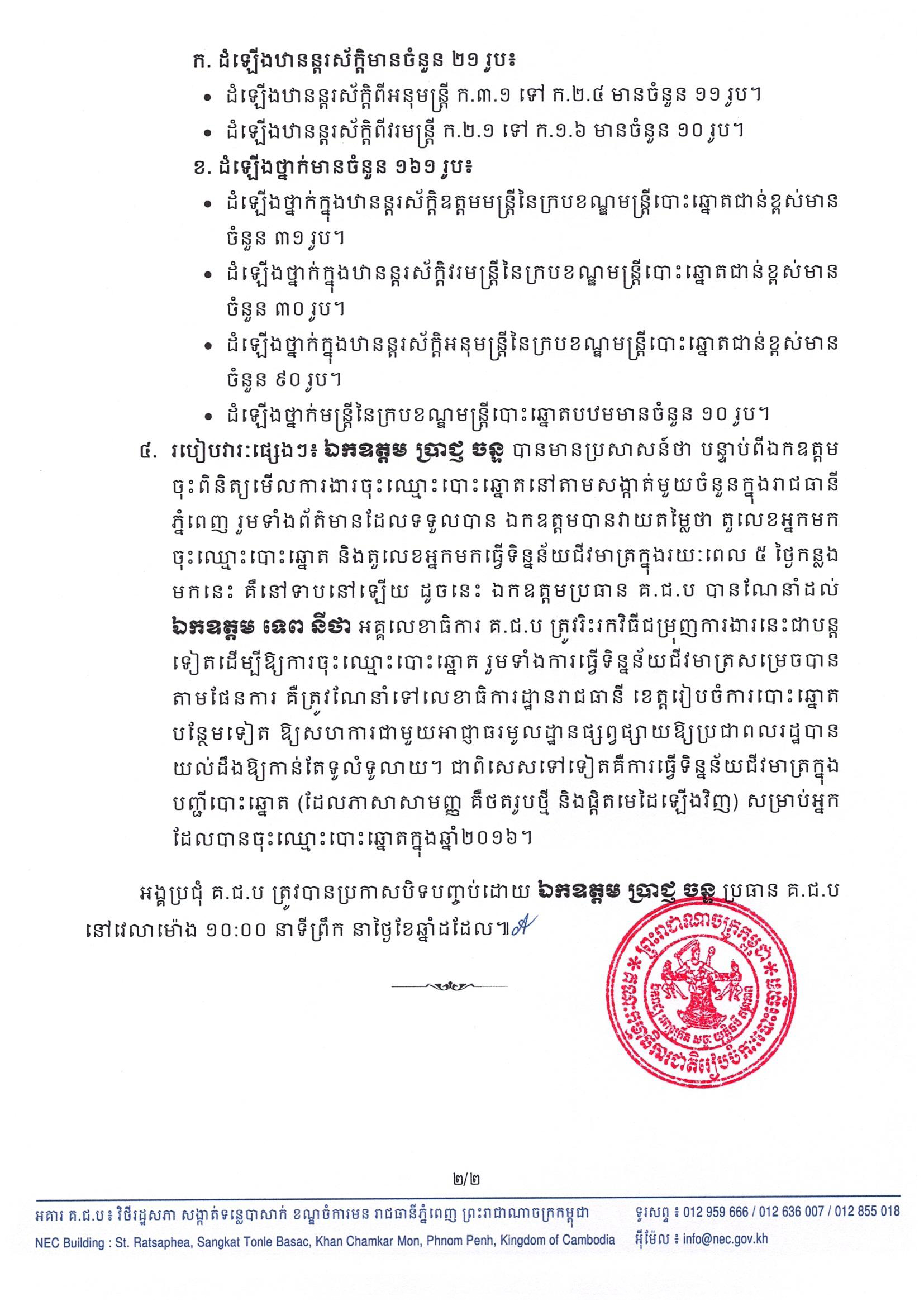 ឯកឧត្តម ទេព នីថា អគ្គលេខាធិការ គ.ជ.ប ត្រូវរិះរកវិធីជម្រុញការងារនេះជាបន្តទៀតដើម្បីឱ្យការចុះឈ្មោះបោះឆ្នោត រួមទាំងការធ្វើទិន្នន័យជីវមាត្រសម្រេចបានតាមផែនការ គឺត្រូវណែនាំទៅលេខាធិការដ្ឋានរាជធានី ខេត្តរៀបចំការបោះឆ្នោត បន្ថែមទៀត ឱ្យសហការជាមួយអាជ្ញាធរមូលដ្ឋានផ្សព្វផ្សាយឱ្យប្រជាពលរដ្ឋបានយល់ដឹងឱ្យកាន់តែទូលំទូលាយ។ ជាពិសេសទៅទៀតគឺការធ្វើទិន្នន័យជីវមាត្រក្នុងបញ្ជីបោះឆ្នោត (ដែលភាសាសាមញ្ញ គឺថតរូបថ្មី និងផ្តិតមេដៃឡើងវិញ) សម្រាប់អ្នកដែលបានចុះឈ្មោះបោះឆ្នោតក្នុងឆ្នាំ២០១៦។