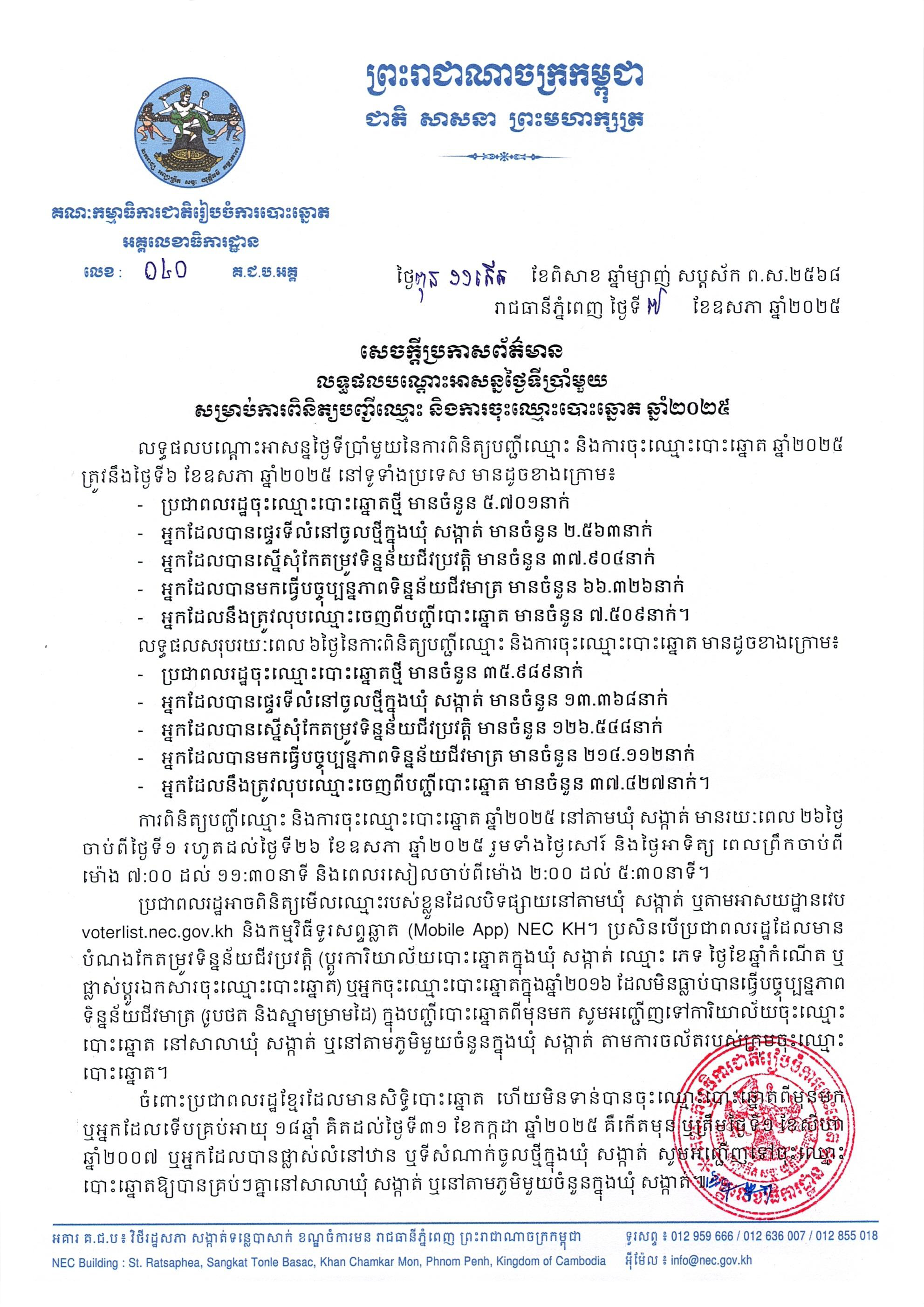 ចំពោះប្រជាពលរដ្ឋខ្មែរដែលមានសិទ្ធិបោះឆ្នោត ហើយមិនទាន់បានចុះឈ្មោះបោះឆ្នោតពីមុនមក ឬអ្នកដែលទើបគ្រប់អាយុ ១៨ឆ្នាំ គិតដល់ថ្ងៃទី៣១ ខែកក្កដា ឆ្នាំ២០២៥ គឺកើតមុន ឬត្រឹមថ្ងៃទី១ ខែសីហា ឆ្នាំ២០០៧ ឬអ្នកដែលបានផ្លាស់លំនៅឋាន ឬទីសំណាក់ចូលថ្មីក្នុងឃុំ សង្កាត់ សូមអញ្ជើញទៅចុះឈ្មោះបោះឆ្នោតឱ្យបានគ្រប់ៗគ្នានៅសាលាឃុំ សង្កាត់ ឬនៅតាមភូមិមួយចំនួនក្នុងឃុំ សង្កាត់៕