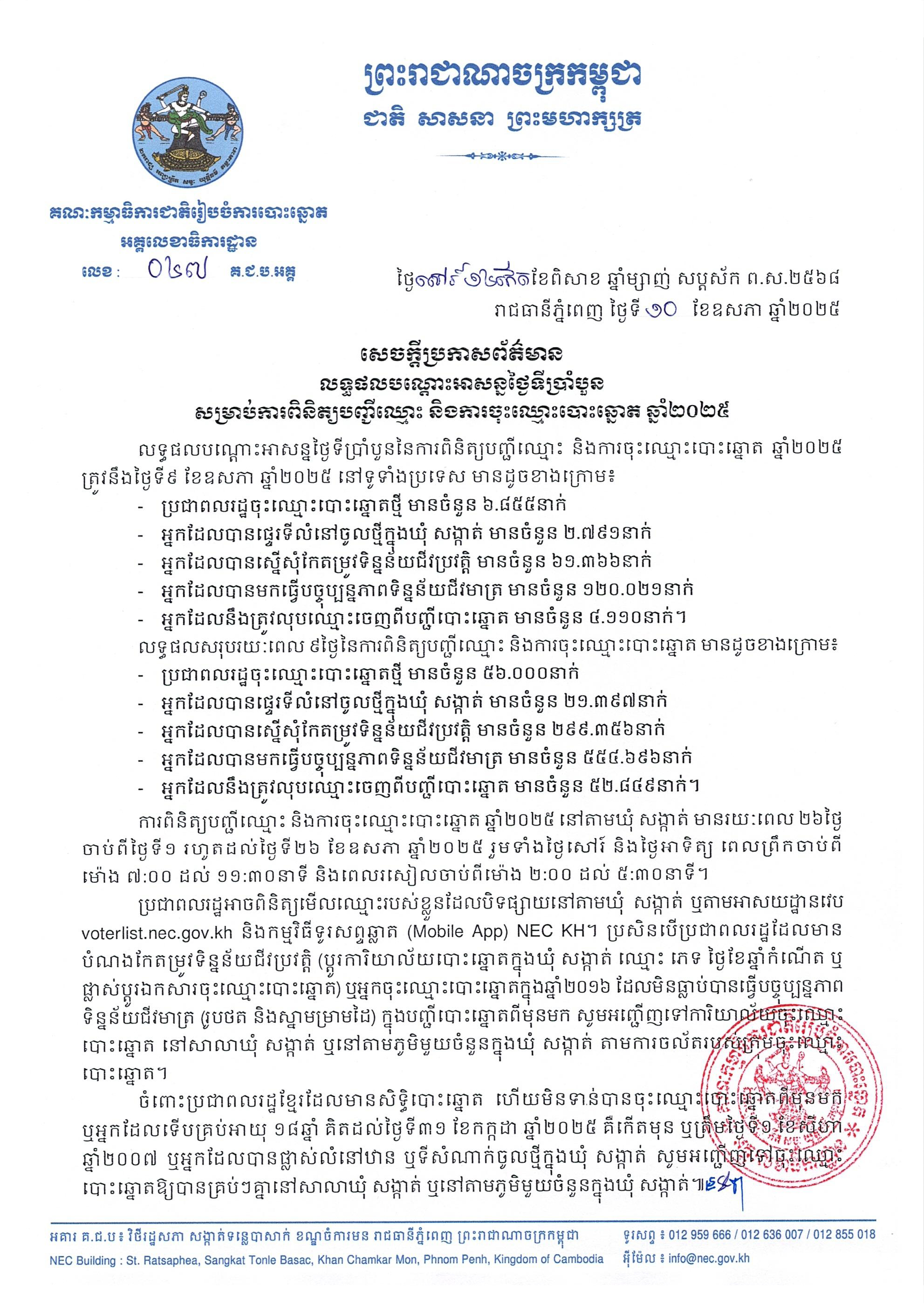 ចំពោះប្រជាពលរដ្ឋខ្មែរដែលមានសិទ្ធិបោះឆ្នោត ហើយមិនទាន់បានចុះឈ្មោះបោះឆ្នោតពីមុនមក ឬអ្នកដែលទើបគ្រប់អាយុ ១៨ឆ្នាំ គិតដល់ថ្ងៃទី៣១ ខែកក្កដា ឆ្នាំ២០២៥ គឺកើតមុន ឬត្រឹមថ្ងៃទី១ ខែសីហា ឆ្នាំ២០០៧ ឬអ្នកដែលបានផ្លាស់លំនៅឋាន ឬទីសំណាក់ចូលថ្មីក្នុងឃុំ សង្កាត់ សូមអញ្ជើញទៅចុះឈ្មោះបោះឆ្នោតឱ្យបានគ្រប់ៗគ្នានៅសាលាឃុំ សង្កាត់ ឬនៅតាមភូមិមួយចំនួនក្នុងឃុំ សង្កាត់៕