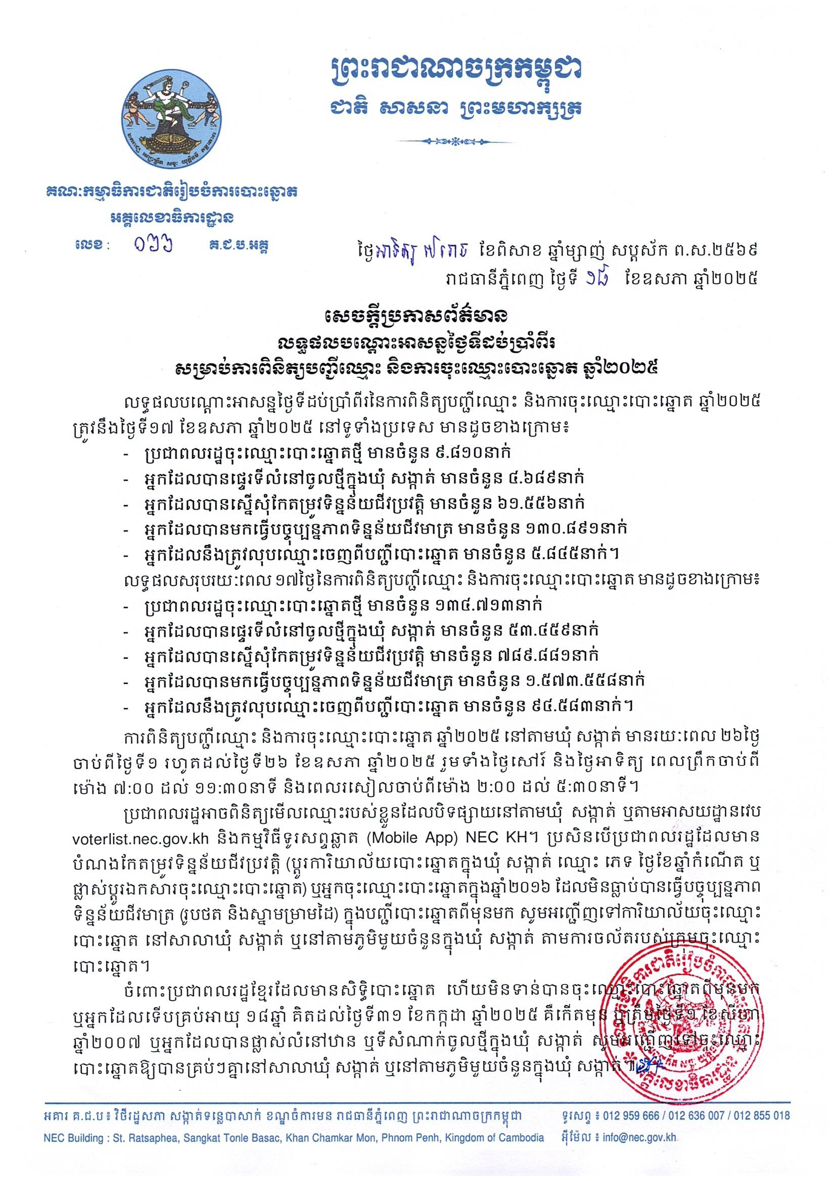 ចំពោះប្រជាពលរដ្ឋខ្មែរដែលមានសិទ្ធិបោះឆ្នោត ហើយមិនទាន់បានចុះឈ្មោះបោះឆ្នោតពីមុនមក ឬអ្នកដែលទើបគ្រប់អាយុ ១៨ឆ្នាំ គិតដល់ថ្ងៃទី៣១ ខែកក្កដា ឆ្នាំ២០២៥ គឺកើតមុន ឬត្រឹមថ្ងៃទី១ ខែសីហា ឆ្នាំ២០០៧ ឬអ្នកដែលបានផ្លាស់លំនៅឋាន ឬទីសំណាក់ចូលថ្មីក្នុងឃុំ សង្កាត់ សូមអញ្ជើញទៅចុះឈ្មោះបោះឆ្នោតឱ្យបានគ្រប់ៗគ្នានៅសាលាឃុំ សង្កាត់ ឬនៅតាមភូមិមួយចំនួនក្នុងឃុំ សង្កាត់៕