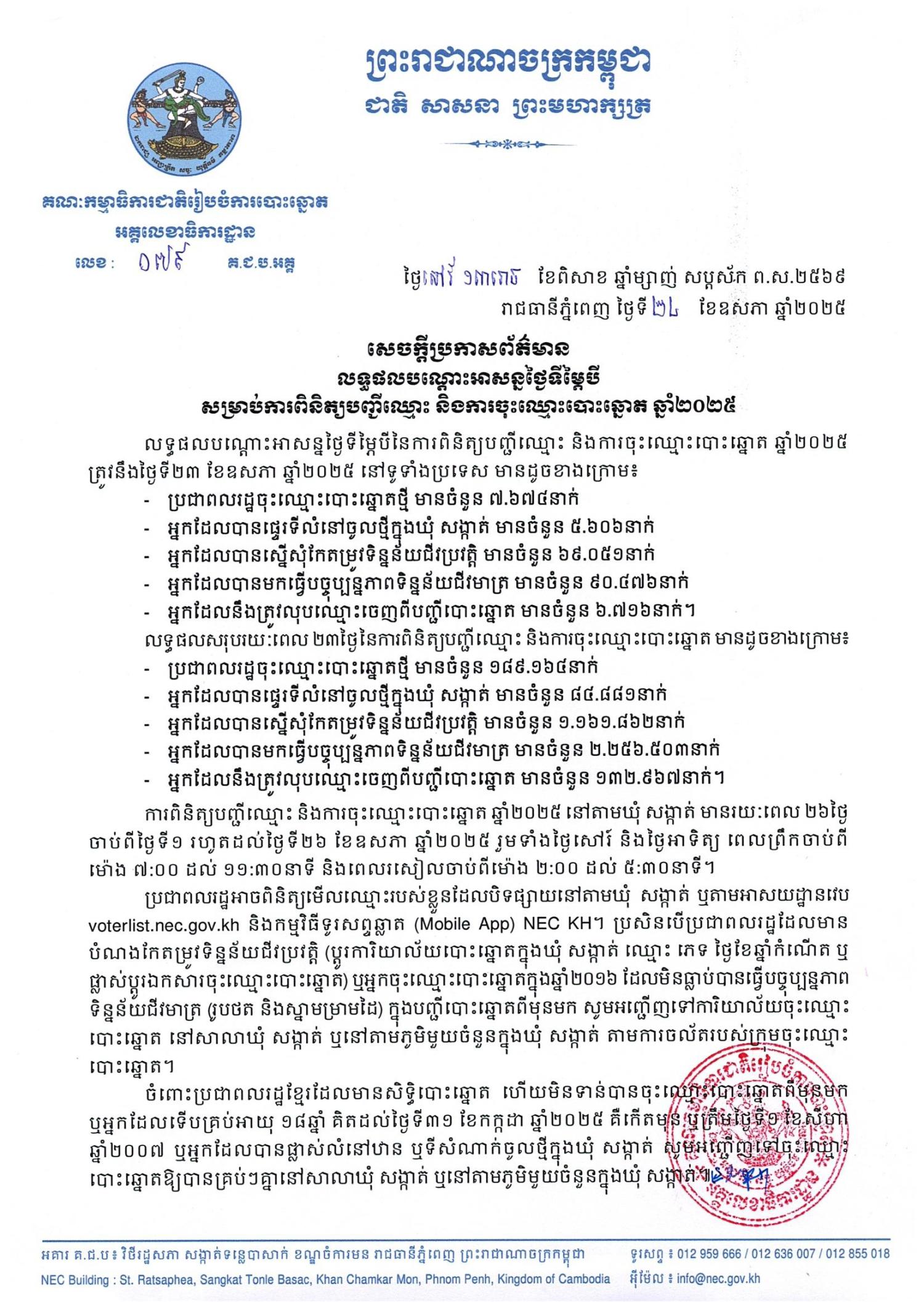 លទ្ធផលបណ្ដោះអាសន្នថ្ងៃទីម្ភៃបីនៃការពិនិត្យបញ្ជីឈ្មោះ និងការចុះឈ្មោះបោះឆ្នោត ឆ្នាំ២០២៥ ត្រូវនឹងថ្ងៃទី២៣ ខែឧសភា ឆ្នាំ២០២៥ នៅទូទាំងប្រទេស មានដូចខាងក្រោម៖