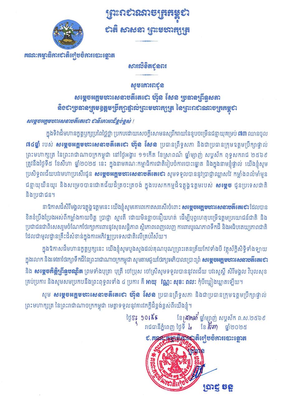 សារលិខិតជូនពរ សម្តេចអគ្គមហាសេនាបតីតេជោ ហ៊ុន សែន ប្រធានព្រឹទ្ធសភា និងជាប្រធានក្រុមឧត្តមប្រឹក្សាផ្ទាល់ព្រះមហាក្សត្រ នៃព្រះរាជាណាចក្រកម្ពុជា ក្នុងទិវាដ៏មហានក្ខត្តឫក្សប្រពៃថ្លៃថ្លា ប្រកបដោយសេចក្តីសោមនស្សរីករាយនៃខួបចម្រើនជន្មាយុគម្រប់ ៧៣ ឈានចូល ៧៤ឆ្នាំ