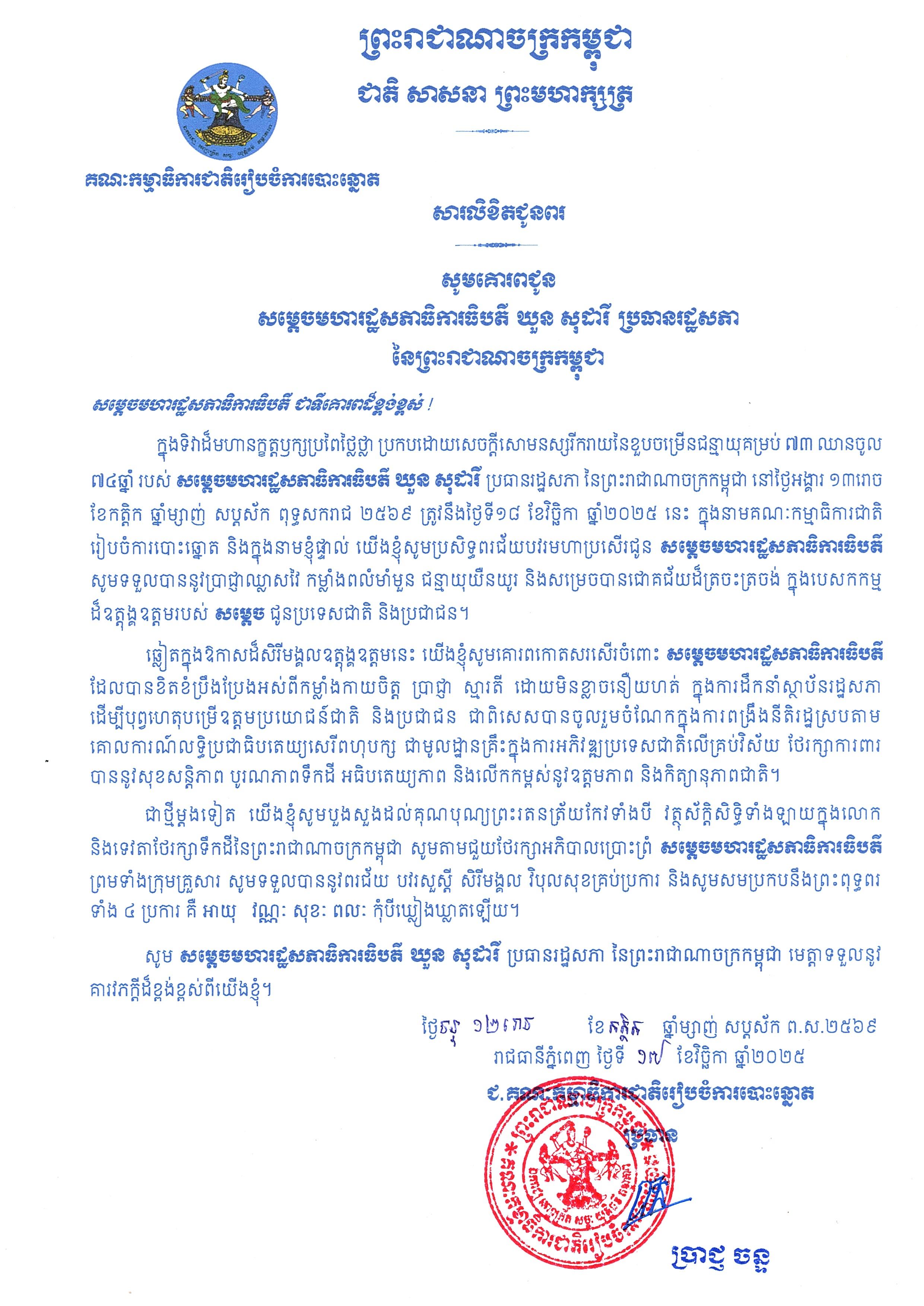 សារលិខិតជូនពរ សូមគោរពជូន សម្ដេចមហារដ្ឋសភាធិការធិបតី ឃួន សុដារី ប្រធានរដ្ឋសភា នៃព្រះរាជាណាចក្រកម្ពុជា ក្នុងទិវាដ៏មហានក្ខត្តឫក្សប្រពៃថ្លៃថ្លា ប្រកបដោយសេចក្ដីសោមនស្សរីករាយនៃខួបចម្រើនជន្មាយុគម្រប់ ៧៣ ឈានចូល ៧៤ ឆ្នាំ