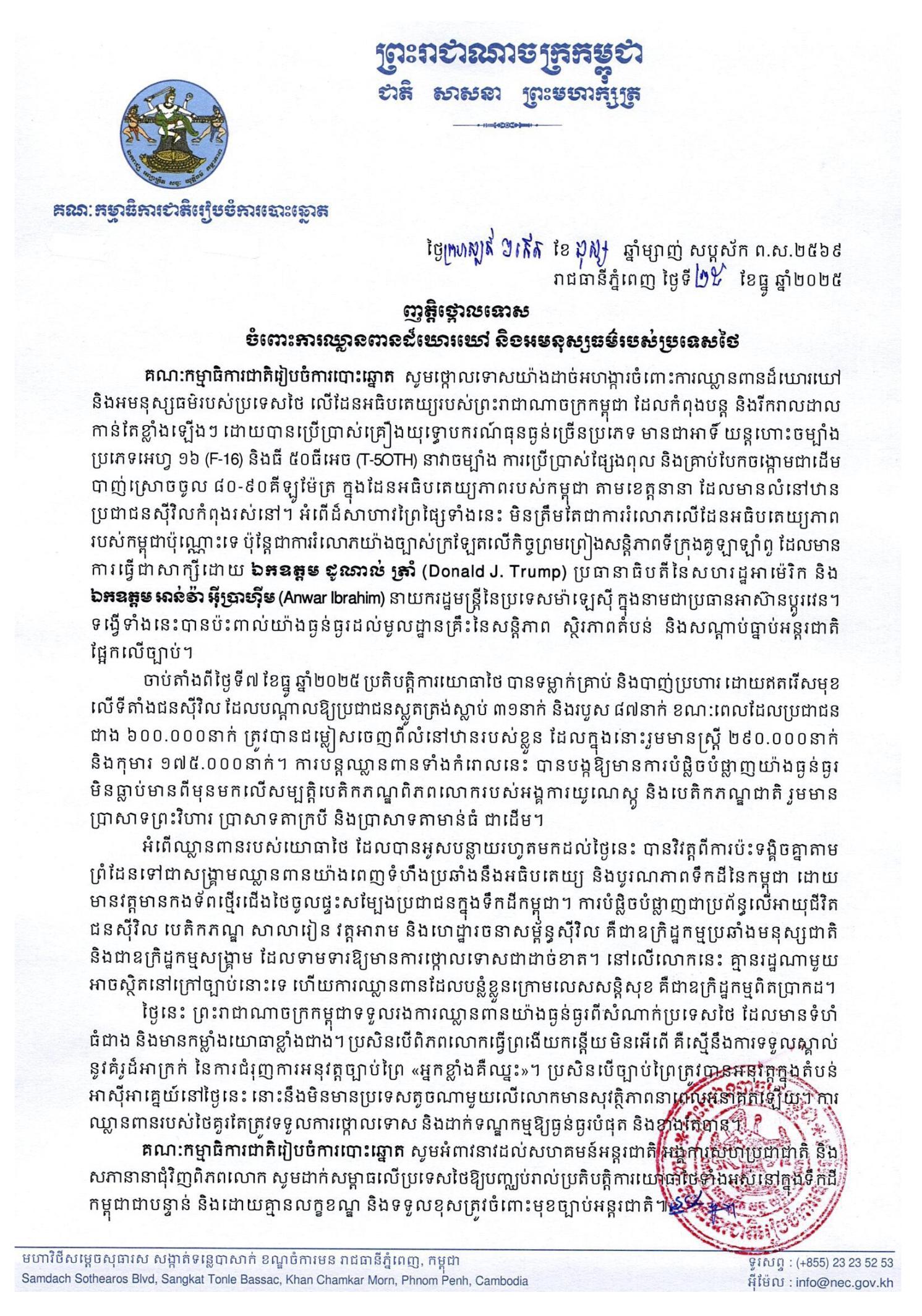 គណៈកម្មាធិការជាតិរៀបចំការបោះឆ្នោត សូមថ្កោលទោសយ៉ាងដាច់អហង្ការចំពោះការឈ្លានពានដ៏ឃោរឃៅ និងអមនុស្សធម៌របស់ប្រទេសថៃ លើដែនអធិបតេយ្យរបស់ព្រះរាជាណាចក្រកម្ពុជា ដែលកំពុងបន្ត និងរីករាលដាលកាន់តែខ្លាំងឡើងៗ ដោយបានប្រើប្រាស់គ្រឿងយុទ្ធោបករណ៍ធុនធ្ងន់ច្រើនប្រភេទ មានជាអាទិ៍ យន្តហោះចម្បាំងប្រភេទអេហ្វ ១៦ (F-16) និងធី ៥០ធីអេច (T-5OTH) នាវាចម្បាំង ការប្រើប្រាស់ផ្សែងពុល និងគ្រាប់បែកចង្កោមជាដើម បាញ់ស្រោចចូល ៨០-៩០គីឡូម៉ែត្រ ក្នុងដែនអធិបតេយ្យភាពរបស់កម្ពុជា តាមខេត្តនានា ដែលមានលំនៅឋានប្រជាជនស៊ីវិលកំពុងរស់នៅ។ អំពើដ៏សាហាវព្រៃផ្សៃទាំងនេះ មិនត្រឹមតែជាការរំលោភលើដែនអធិបតេយ្យភាពរបស់កម្ពុជាប៉ុណ្ណោះទេ ប៉ុន្តែជាការរំលោភយ៉ាងច្បាស់ក្រឡែតលើកិច្ចព្រមព្រៀងសន្តិភាពទីក្រុងគូឡាឡាំពួ ដែលមានការធ្វើជាសាក្សីដោយ ឯកឧត្តម ដូណាល់ ត្រាំ (Donald J. Trump) ប្រធានាធិបតីនៃសហរដ្ឋអាម៉េរិក និង ឯកឧត្តម អាន់វ៉ា អ៊ីប្រាហ៊ីម (Anwar Ibrahim) នាយករដ្ឋមន្ត្រីនៃប្រទេសម៉ាឡេស៊ី ក្នុងនាមជាប្រធានអាស៊ានប្ដូរវេន។ ទង្វើទាំងនេះបានប៉ះពាល់យ៉ាងធ្ងន់ធ្ងរដល់មូលដ្ឋានគ្រឹះនៃសន្តិភាព ស្ថិរភាពតំបន់ និងសណ្ដាប់ធ្នាប់អន្តរជាតិផ្អែកលើច្បាប់។
