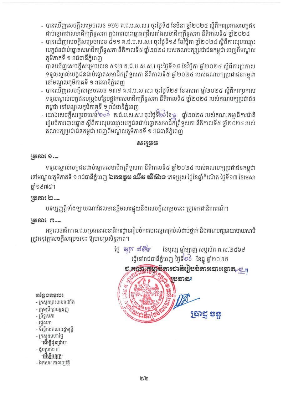សេចក្តីសម្រេច លេខ ២០៧ គ.ជ.ប.ស.ស.រ ស្តីពីការប្រកាសទទួលស្គាល់បេក្ខជនជាប់ឆ្នោតសមាជិកព្រឹទ្ធសភា នីតិកាលទី៥ ឆ្នាំ២០២៤ របស់គណបក្សប្រជាជនកម្ពុជា នៅមណ្ឌលភូមិភាគទី១ រាជធានីភ្នំពេញ