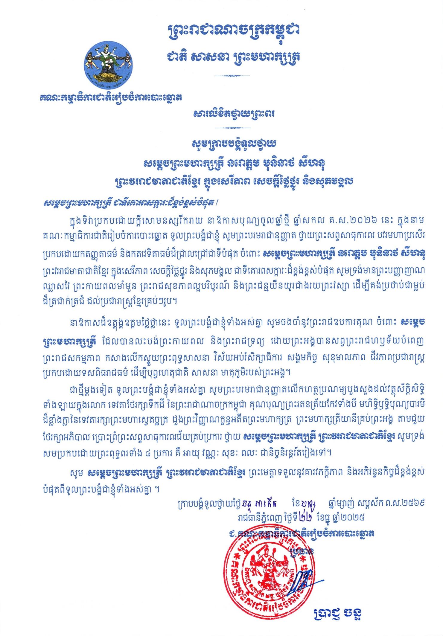 សារលិខិតថ្វាយព្រះពរ សម្តេចព្រះមហាក្សត្រី នរោត្តម មុនិនាថ សីហនុ ព្រះវររាជមាតាជាតិខ្មែរ ក្នុងសេរីភាព សេចក្ដីថ្លៃថ្នូរ និងសុភមង្គល ក្នុងទិវាប្រកបដោយក្តីសោមនស្សរីករាយ នាឱកាសបុណ្យចូលឆ្នាំថ្មី ឆ្នាំសកល គ.ស.២០២៦