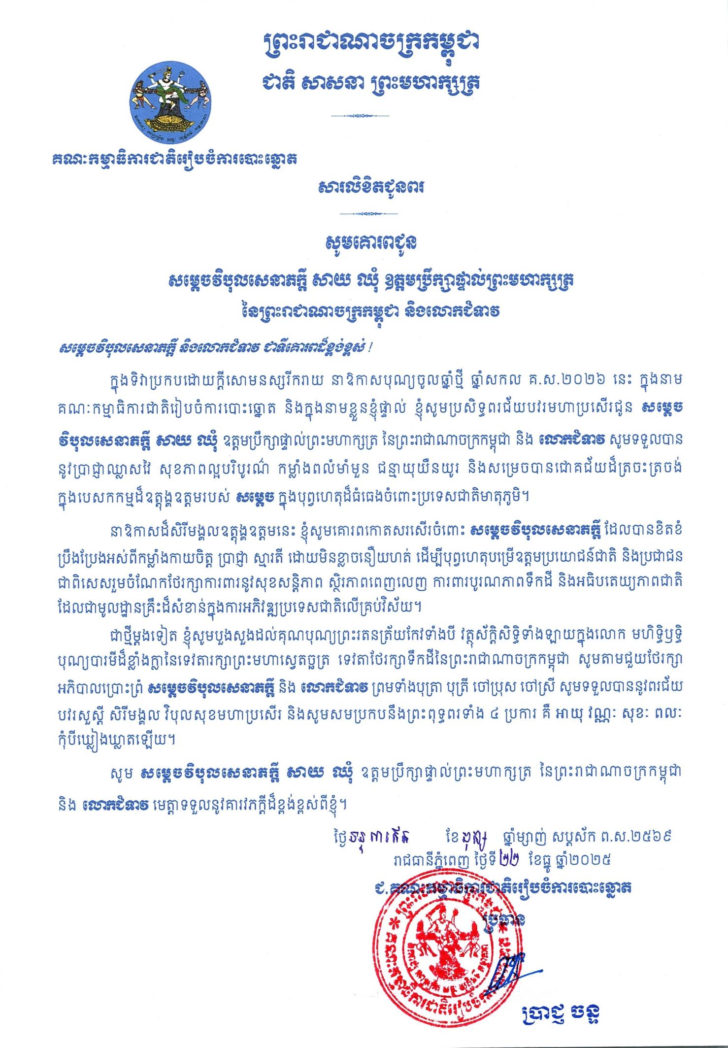 សារលិខិតជូនពរ សម្តេចវិបុលសេនាភក្តី សាយ ឈុំ ឧត្តមប្រឹក្សាផ្ទាល់ព្រះមហាក្សត្រ នៃព្រះរាជាណាចក្រកម្ពុជា និងលោកជំទាវ ក្នុងទិវាប្រកបដោយក្តីសោមនស្សរីករាយ នាឱកាសបុណ្យចូលឆ្នាំថ្មី ឆ្នាំសកល គ.ស.២០២៦