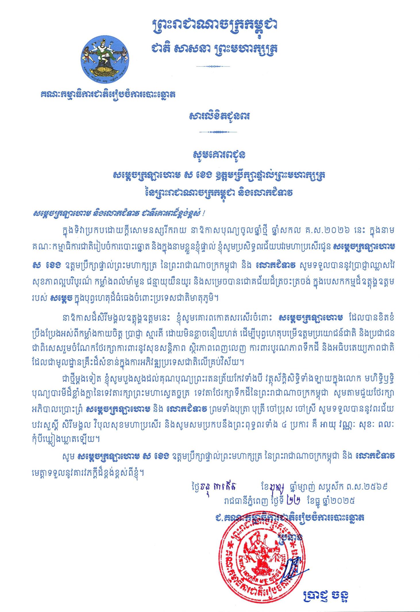 សារលិខិតជូនពរ សម្តេចក្រឡាហោម ស ខេង ឧត្តមប្រឹក្សាផ្ទាល់ព្រះមហាក្សត្រ នៃព្រះរាជាណាចក្រកម្ពុជា និងលោកជំទាវ ក្នុងទិវាប្រកបដោយក្តីសោមនស្សរីករាយ នាឱកាសបុណ្យចូលឆ្នាំថ្មី ឆ្នាំសកល គ.ស.២០២៦