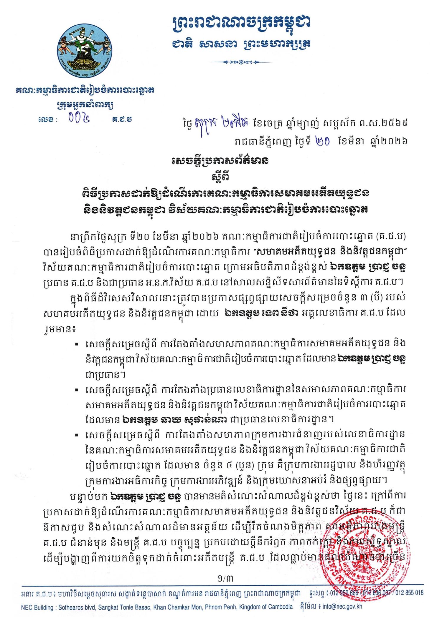 សេចក្តីប្រកាសព័ត៌មានរបស់អ្នកនាំពាក្យ គ.ជ.ប លេខ ០០៤ គ.ជ.ប ស្តីពី ពិធីប្រកាសដាក់ឱ្យដំណើរការគណៈកម្មាធិការសមាគមអតីតយុទ្ធជន និងនិវត្តជនកម្ពុជា វិស័យគណៈកម្មាធិការជាតិរៀបចំការបោះឆ្នោត