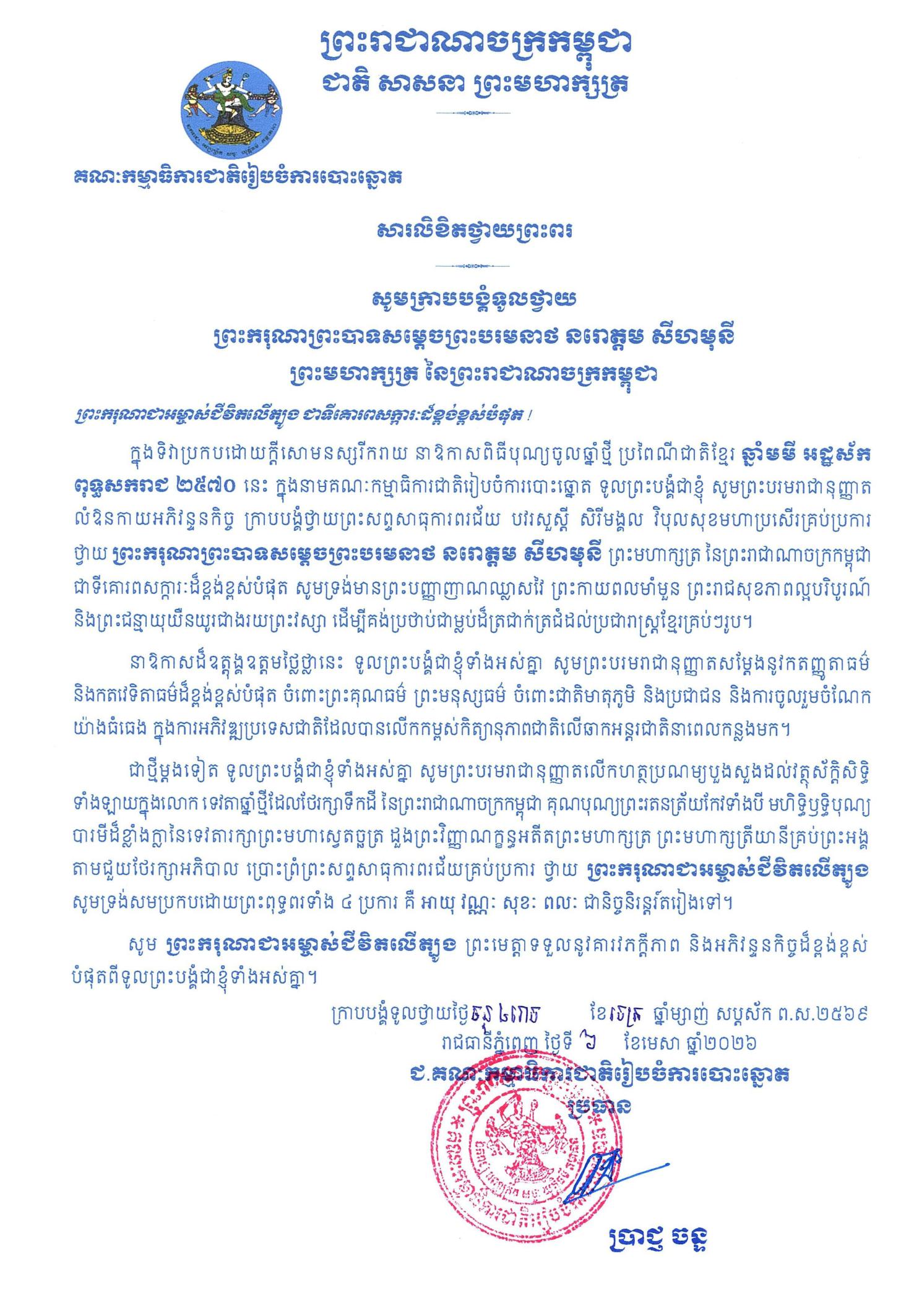 សារលិខិតថ្វាយព្រះពរ ព្រះករុណាព្រះបាទសម្ដេចព្រះបរមនាថ នរោត្ដម សីហមុនី ព្រះមហាក្សត្រ នៃព្រះរាជាណាចក្រកម្ពុជា ក្នុងទិវាប្រកបដោយក្តីសោមនស្សរីករាយ នាឱកាសព្រះរាជពិធីបុណ្យចូលឆ្នាំថ្មី ប្រពៃណីជាតិខ្មែរ ឆ្នាំមមី អដ្ឋស័ក ពុទ្ធសករាជ ២៥៧០ ខាងមុខនេះ