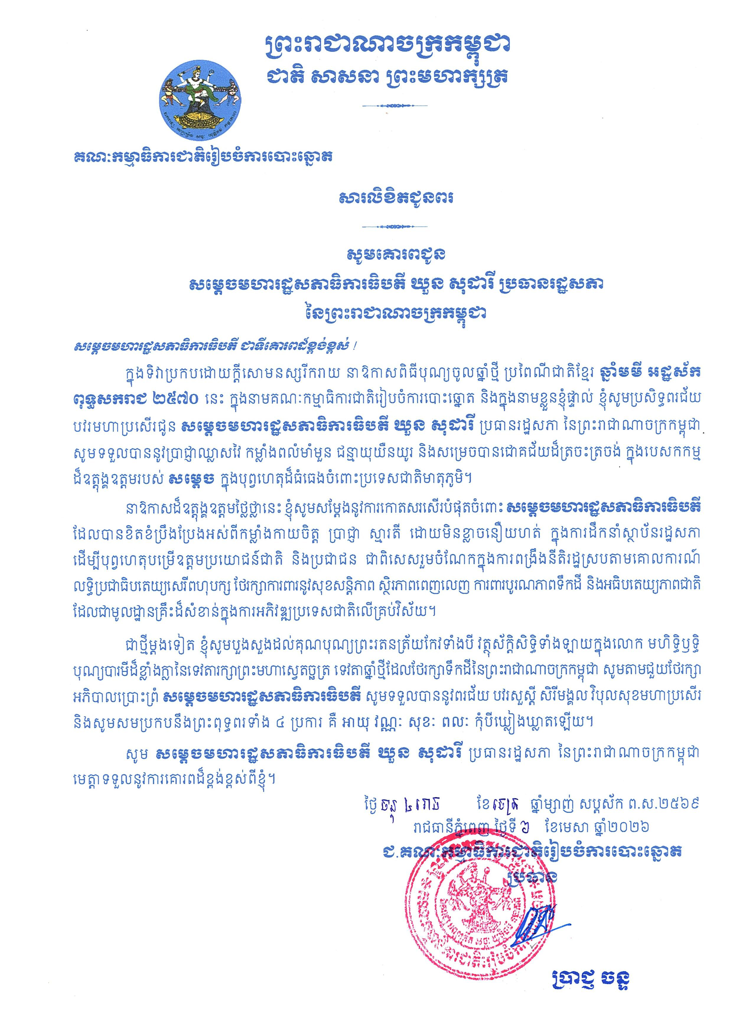 សារលិខិតជូនពរ សម្ដេចមហារដ្ឋសភាធិការធិបតី ឃួន សុដារី ប្រធានរដ្ឋសភា នៃព្រះរាជាណាចក្រកម្ពុជា ក្នុងទិវាប្រកបដោយក្តីសោមនស្សរីករាយ នាឱកាសពិធីបុណ្យចូលឆ្នាំថ្មី ប្រពៃណីជាតិខ្មែរ ឆ្នាំមមី អដ្ឋស័ក ពុទ្ធសករាជ ២៥៧០ ខាងមុខនេះ