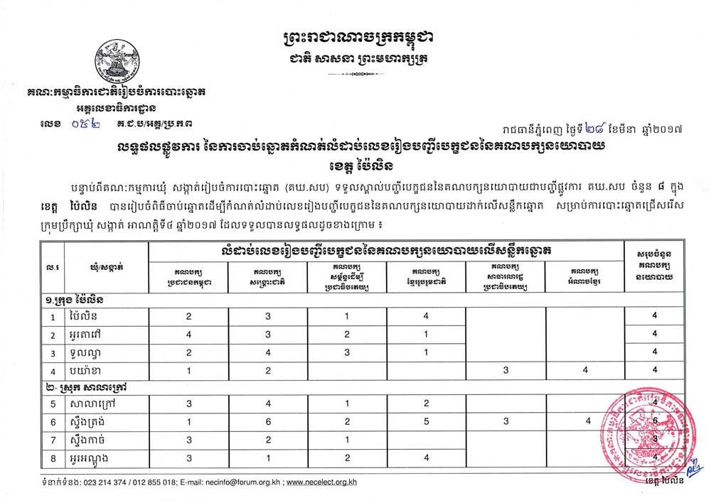 លទ្ធផលផ្លូវការ នៃការចាប់ឆ្នោតកំណត់លំដាប់លេខរៀងបញ្ជីបេក្ខជន នៃគណបក្សនយោបាយឈរឈ្មោះបោះឆ្នោត ខេត្ត ប៉ៃលិន